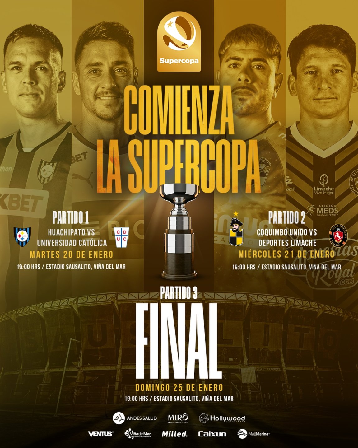 La acción partirá el martes 20 a las 19:00 horas con el pleito entre el campeón de la Copa Chile, Huachipato, y el subcampeón de la Liga de Primera, Universidad Católica.