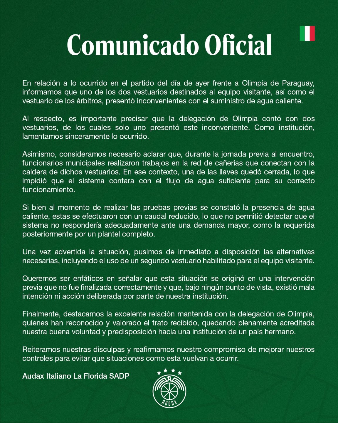 Para cerrar la declaración, Audax Italiano hizo hincapié en los lazos con el cuadro forastero. "Finalmente, destacamos la excelente relación mantenida con la delegación de Olimpia, quienes han reconocido y valorado el trato recibido, quedando plenamente acreditada nuestra buena voluntad y predisposición hacia una institución de un país hermano. Reiteramos nuestras disculpas y reafirmamos nuestro compromiso de mejorar nuestros controles para evitar que situaciones como esta vuelvan a ocurrir", concluyó el texto.