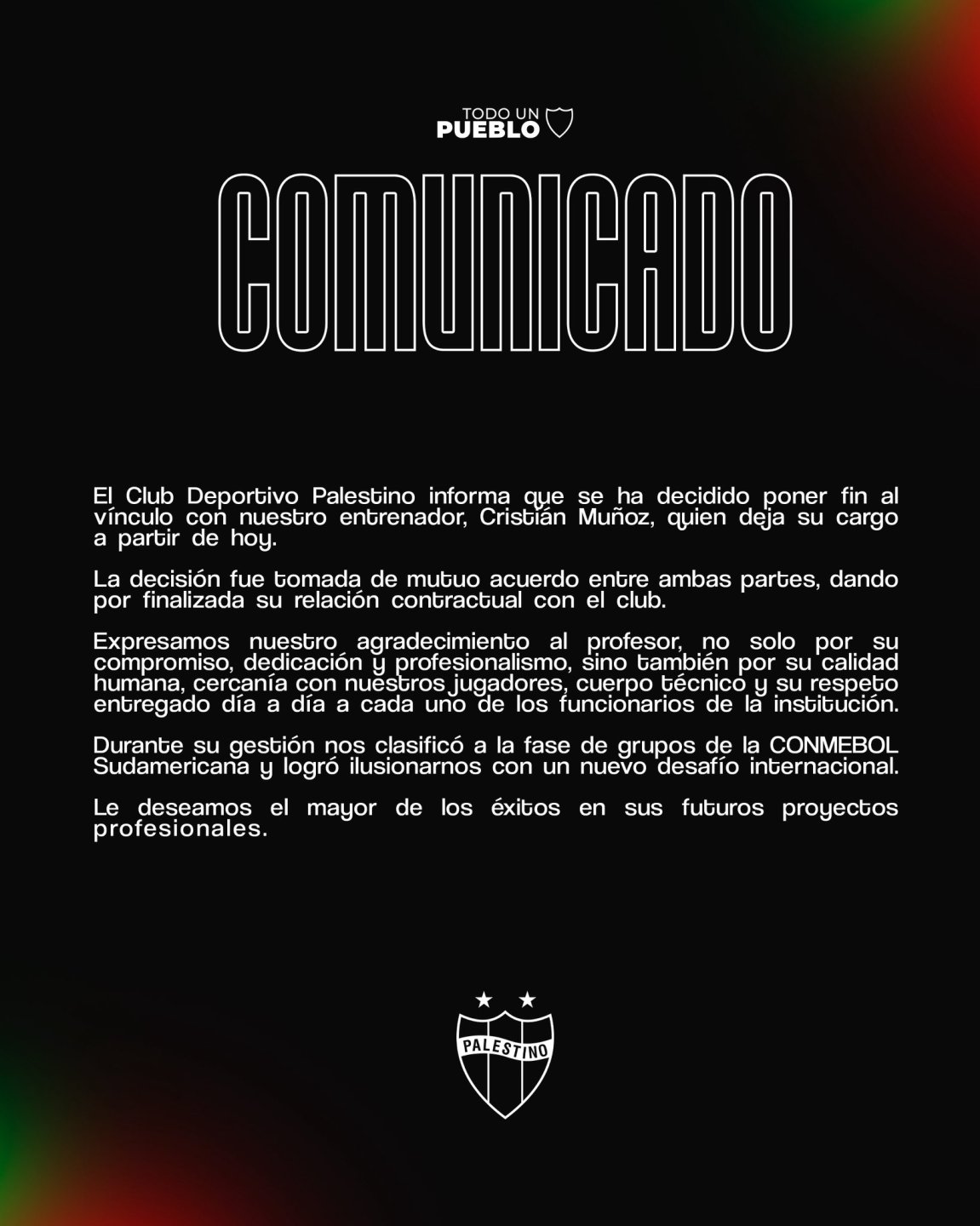 La caída frente a Deportes Concepción, equipo que marcha en el último lugar de la Liga de Primera, desató un intenso revuelo mediático que culminó con una drástica medida: Palestino comunicó oficialmente la desvinculación de su director técnico, Cristián Muñoz.