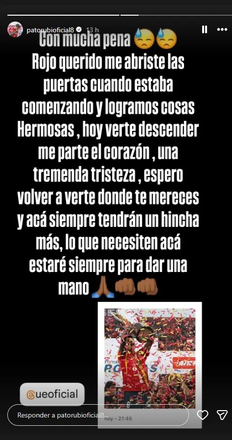 "Con mucha pena, rojo querido me abriste las puertas cuando estaba comenzando y logramos cosas hermosas. Hoy verte descender me parte el corazón, una tremenda tristeza", escribió el atacante en una historia de Instagram.