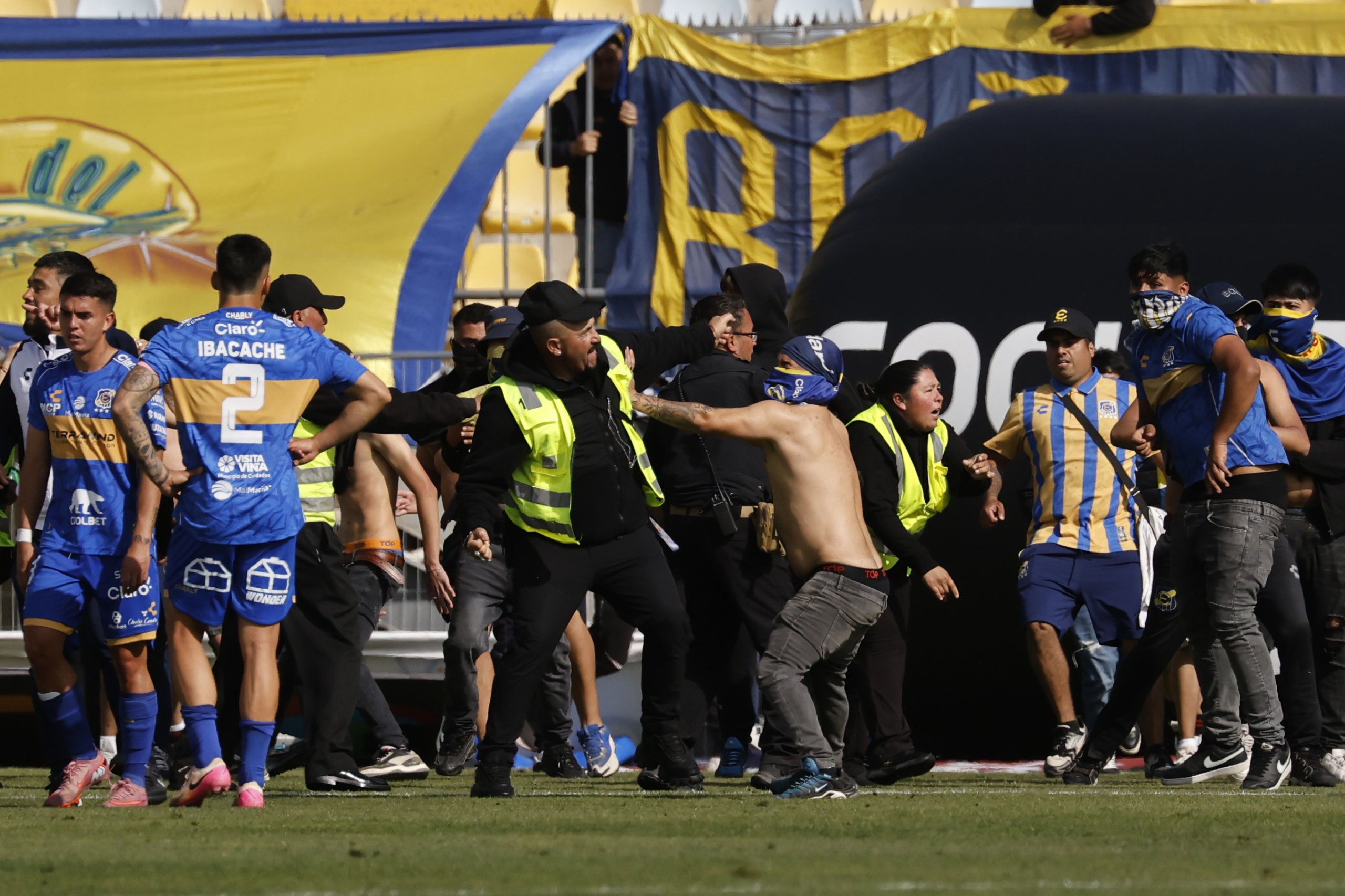El final del duelo se vio empañado por el ingreso de un puñado de mal llamado hinchas del combinado auriazul, quienes provocaron desmanes y se enfrascaron en una confrontación directa con el personal de seguridad, obligando a la intervención de efectivos policiales y a la posterior suspensión del cotejo, justo en momentos en que el colegiado debía revisar un posible penal de Ignacio González a Zampedri que fue desestimado.