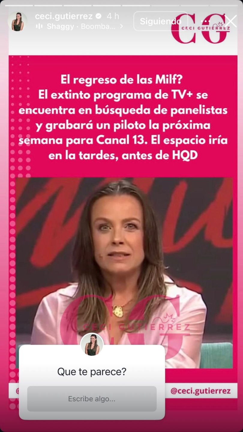 Fue en ese contexto que comenzaron a surgir señales de un posible regreso del emblemático programa. Según reveló la periodista Cecilia Gutiérrez en sus historias de Instagram, ''MILF'' estaría preparando su retorno a la televisión abierta, esta vez en Canal 13. De acuerdo a la información, el espacio se encontraría en búsqueda de panelistas y grabaría un piloto durante la próxima semana.