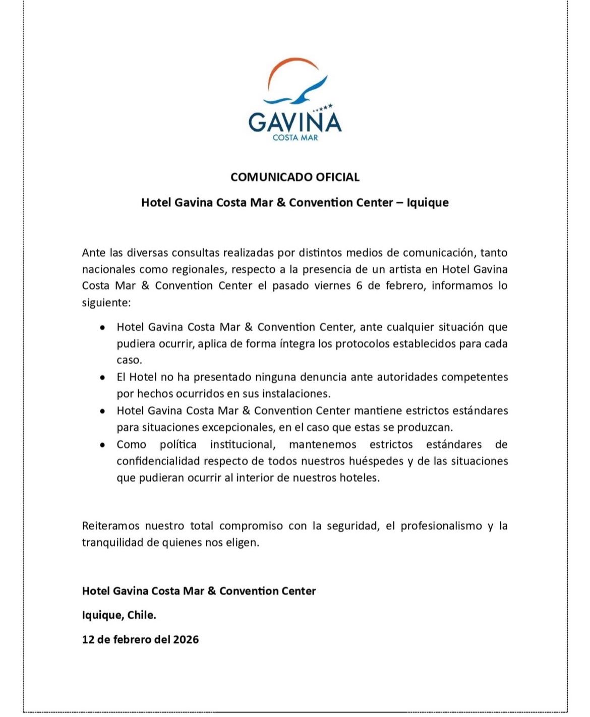 Sin embargo, la versión oficial del lugar difiere y agrega un nuevo giro a la polémica. El Hotel Gavina Costa Mar de Iquique emitió un comunicado para poner límites a los rumores: