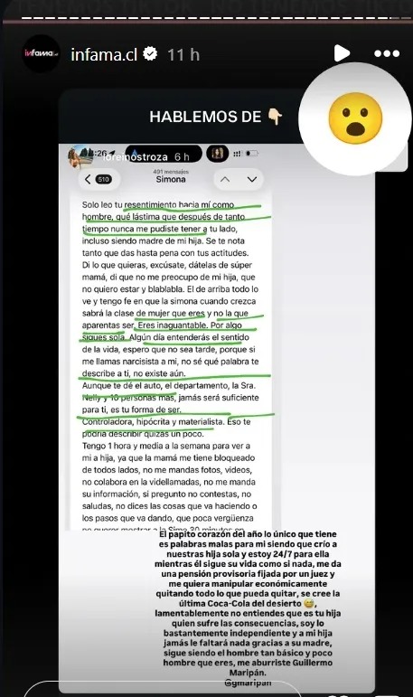 "Soy lo suficientemente independiente y a mi hija jamás le faltará nada gracias a su madre", agregó, para luego cerrar con una frase que suena a quiebre total: "Me aburriste, Guillermo Maripán".