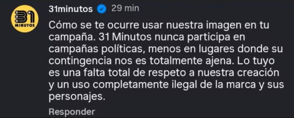 Y desde la cuenta oficial del programa, respondieron que "cómo se te ocurre usar nuestra imagen en tu campaña”. El comunicado agregó: “31 Minutos nunca participa en campañas políticas, menos en lugares donde su contingencia nos es totalmente ajena. Lo tuyo es una falta total de respeto a nuestra creación y un uso completamente ilegal de la marca y sus personajes”.
