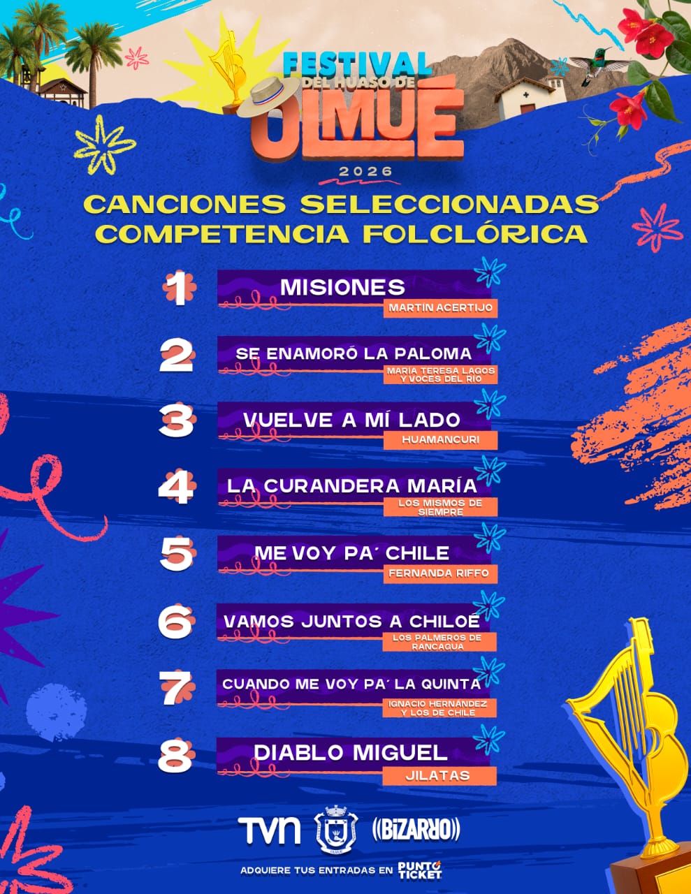 La Comisión Organizadora del Festival del Huaso de Olmué y su Jurado Preseleccionador informaron que ya está definida la nómina oficial de las ocho canciones que participarán en la Competencia Folclórica 2026.