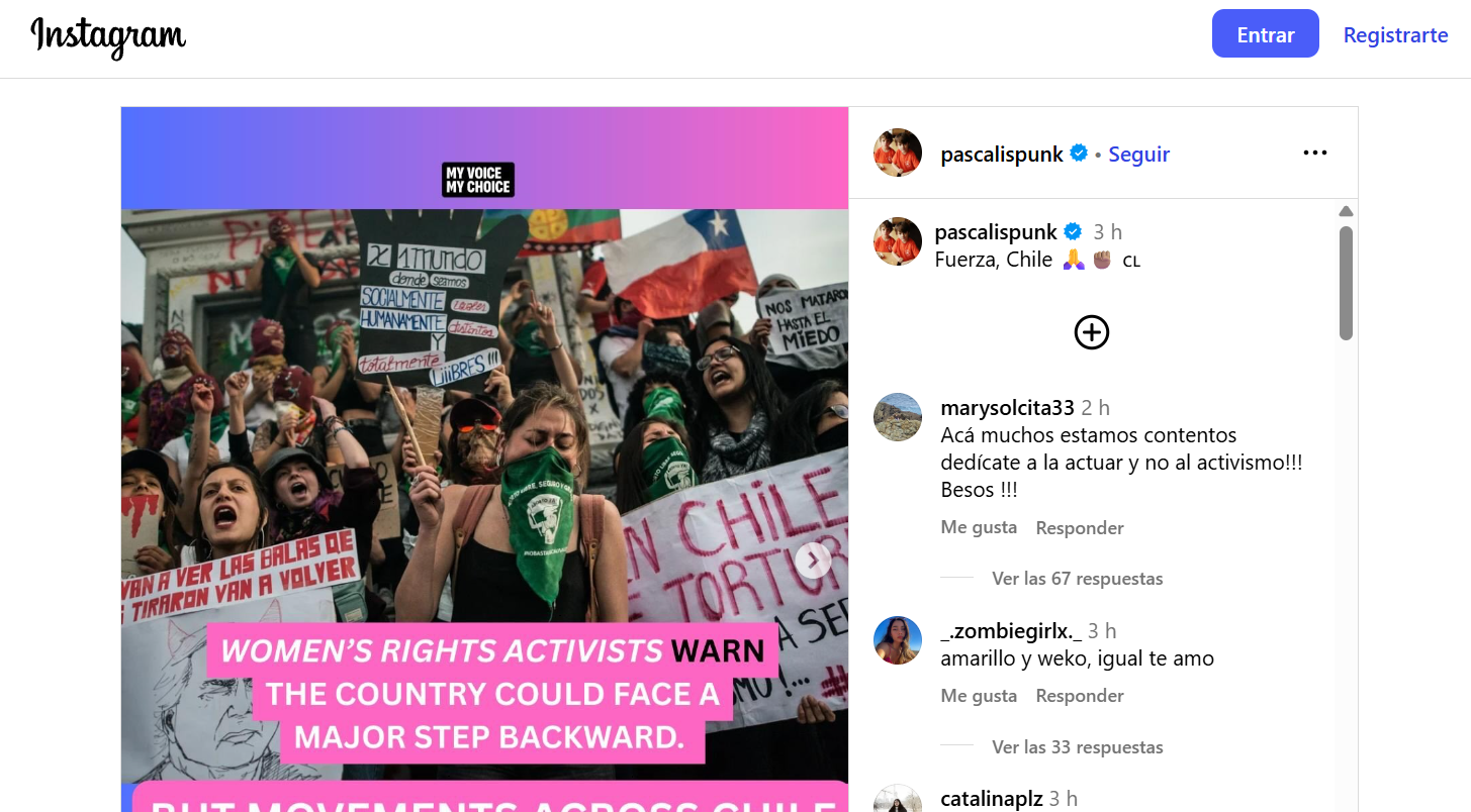Las gráficas compartidas por Pascal, asociadas a la organización My Voice, My Choice, advierten sobre el escenario que enfrentan los derechos reproductivos en el país. En una de ellas se señala que “activistas por los derechos de las mujeres advierten que el país podría enfrentar un importante retroceso. Pero los movimientos en todo Chile dicen que seguirán luchando para proteger los derechos reproductivos”.