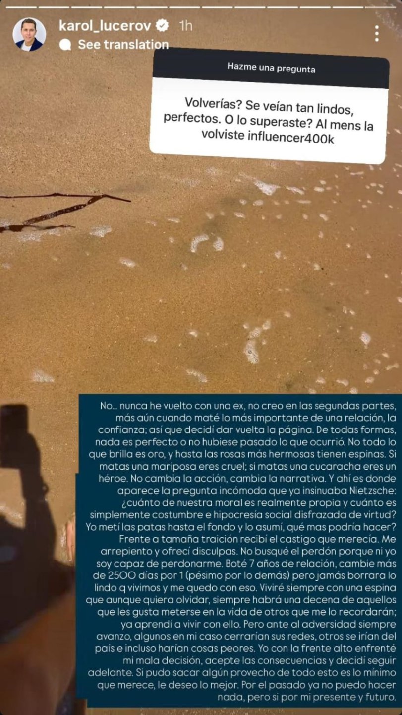 Poco después, el propio Karol respondió a las consultas de sus seguidores en Instagram, donde abrió una ronda de preguntas y respuestas. Allí fue directo al ser consultado sobre la posibilidad de retomar la relación.