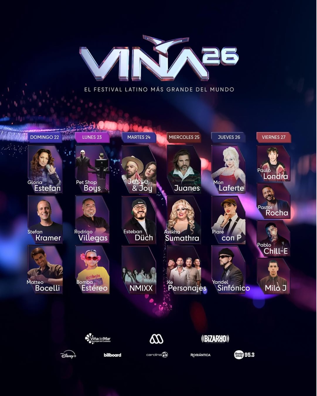 El quinto día será el turno de Piare con Pe, quien se presentará junto a Mon Laferte y Yandel, mientras que el cierre quedará en manos de Pastor Rocha, encargado de poner humor a la denominada noche juvenil, dominada por Pablo Chill-E, Paulo Londra y Milo J.