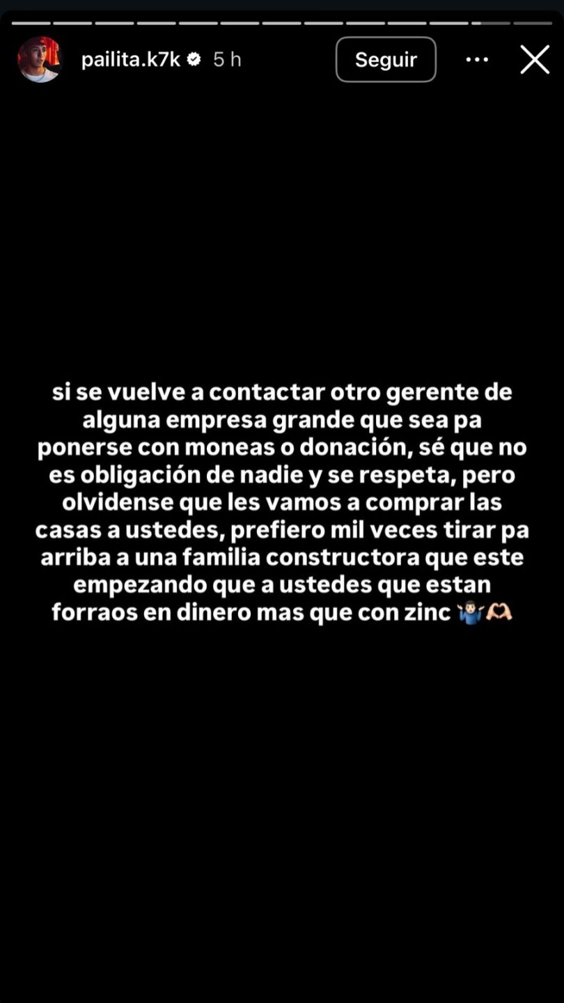 Pailita cerró su mensaje con una crítica al modelo que, a su juicio, prioriza el lucro por sobre la ayuda social. “Prefiero mil veces tirar para arriba a una familia constructora que esté empezando que a ustedes que están forrados en dinero más que con zinc”, concluyó.