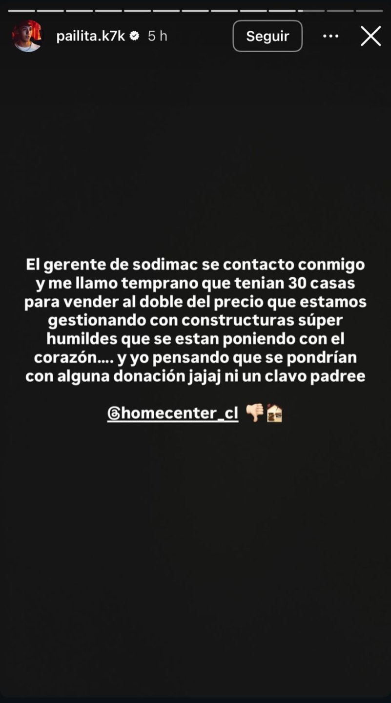 A través de sus historias de Instagram, el artista aseguró que un funcionario de la empresa se contactó con él para ofrecerle la venta de 30 casas, las que, según afirmó, tenían un valor “al doble del precio” que estaba gestionando con constructoras más pequeñas. “Me dijo que tenían 30 casas para vender al doble del precio que estamos gestionando con constructoras súper humildes que se están poniendo con el corazón”, escribió.