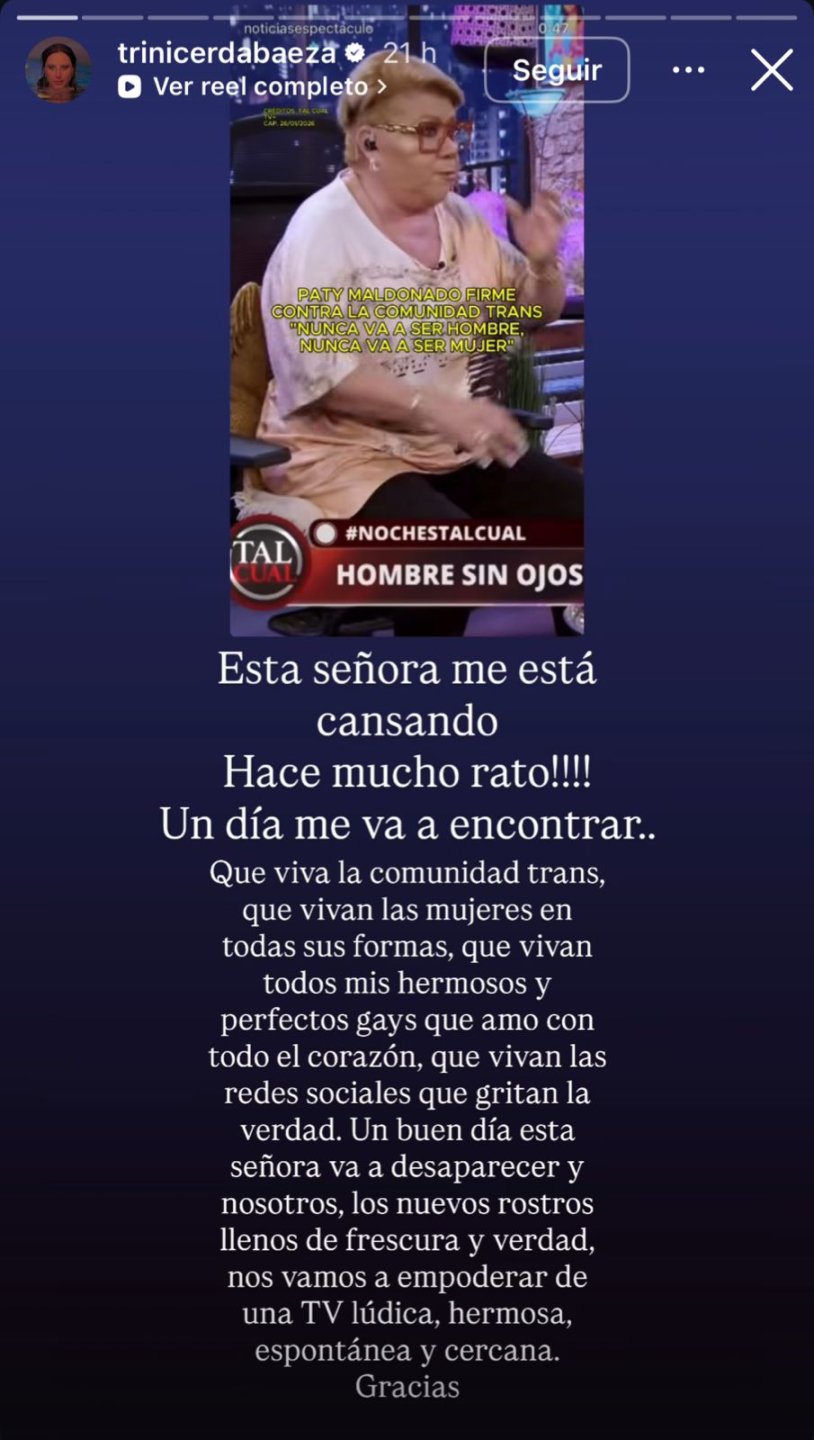Frente a esto, Trini Cerda, quien ha hablado abiertamente sobre su identidad como persona trans desde su paso por Gran Hermano, utilizó su cuenta de Instagram para manifestar su molestia. “Esta señora me está cansando… Hace mucho rato. Un día me va a encontrar”, escribió en una historia.