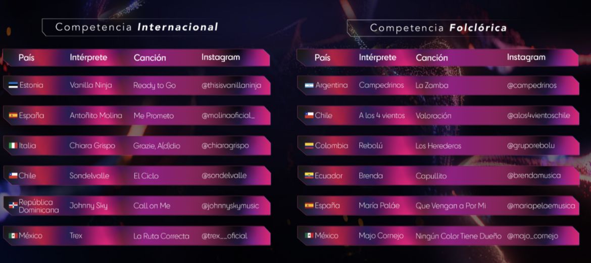 Por su parte en la competencia folclórica, en esta oportunidad se hizo un acercamiento más profundo a la música de raíz y el resultado fue las siguientes canciones e intérpretes: Chile, con el grupo A los 4 vientos y la canción “Valoración”; Argentina, Campedrinos “La Zamba”; México, Majo Cornejo “Ningún color tiene dueño”; España, María Peláe “Que vengan por mi”; Colombia, Rebolú / “Los Herederos” y Ecuador con la cantante Brenda que interpretará “Capullito”.