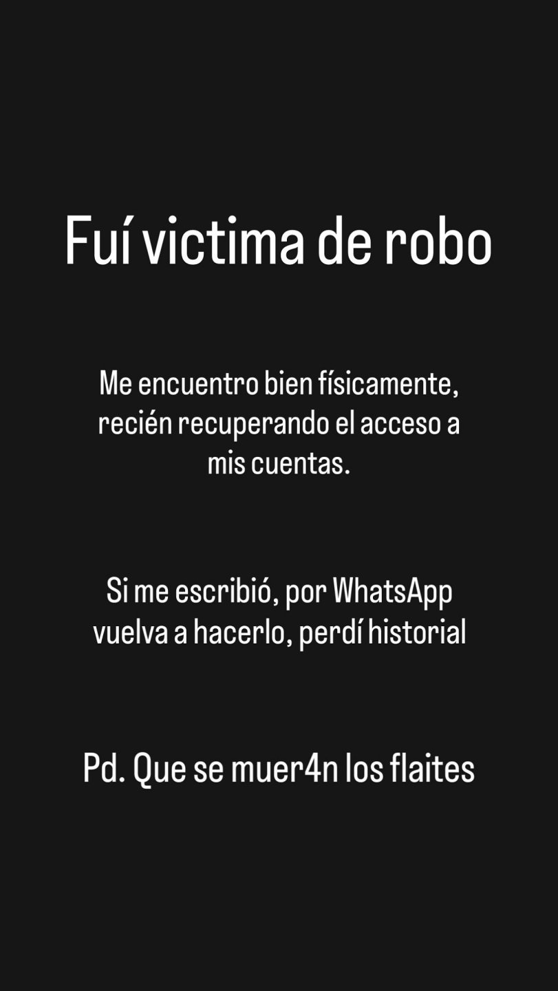 Fue el propio artista quien dio a conocer la situación a través de sus historias de Instagram, donde explicó la razón de su ausencia digital. “Fui víctima de robo. Me encuentro bien físicamente, recién recuperando el acceso a mis cuentas”, escribió, agregando que perdió el historial de WhatsApp tras el incidente.