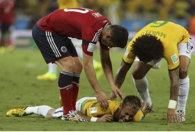 Tras el rechazo de un córner del colombiano Quintero, Neymar, al ir a buscar el balón para el rápido contraataque, fue interceptado por Zúñiga, quien saltó con la rodilla en alto y embistió al ’10′ brasileño por detrás, dejándolo desplomado en el césped y con notorias muestras de dolor.