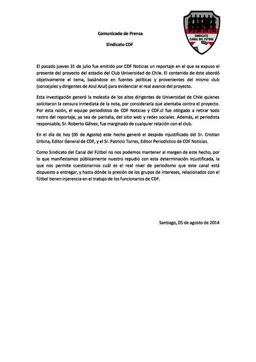 El Sindicato CDF demostró su descontento con la influencia que ejerció Universidad de Chile y el atentado contra la libertad de expresión, a través de un comunicado que adjuntamos en la noticia.