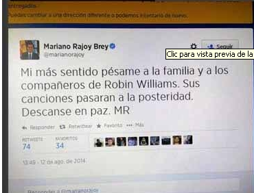 Un eco especial ha tenido una imagen del perfil de Twitter del presidente Mariano Rajoy (@marianorajoy), en la que aparecía el siguiente mensaje: "Mi más sentido pésame a la familia y a los compañeros de Robin Williams. Sus canciones pasarán a la posteridad. Descanse en paz. MR". Tras numerosas numerosas bromas y chanzas, todo apunta a que se trata de una broma de un usuario.