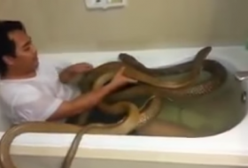 Video: Asiático desquiciado disfruta bañarse junto a su pitón