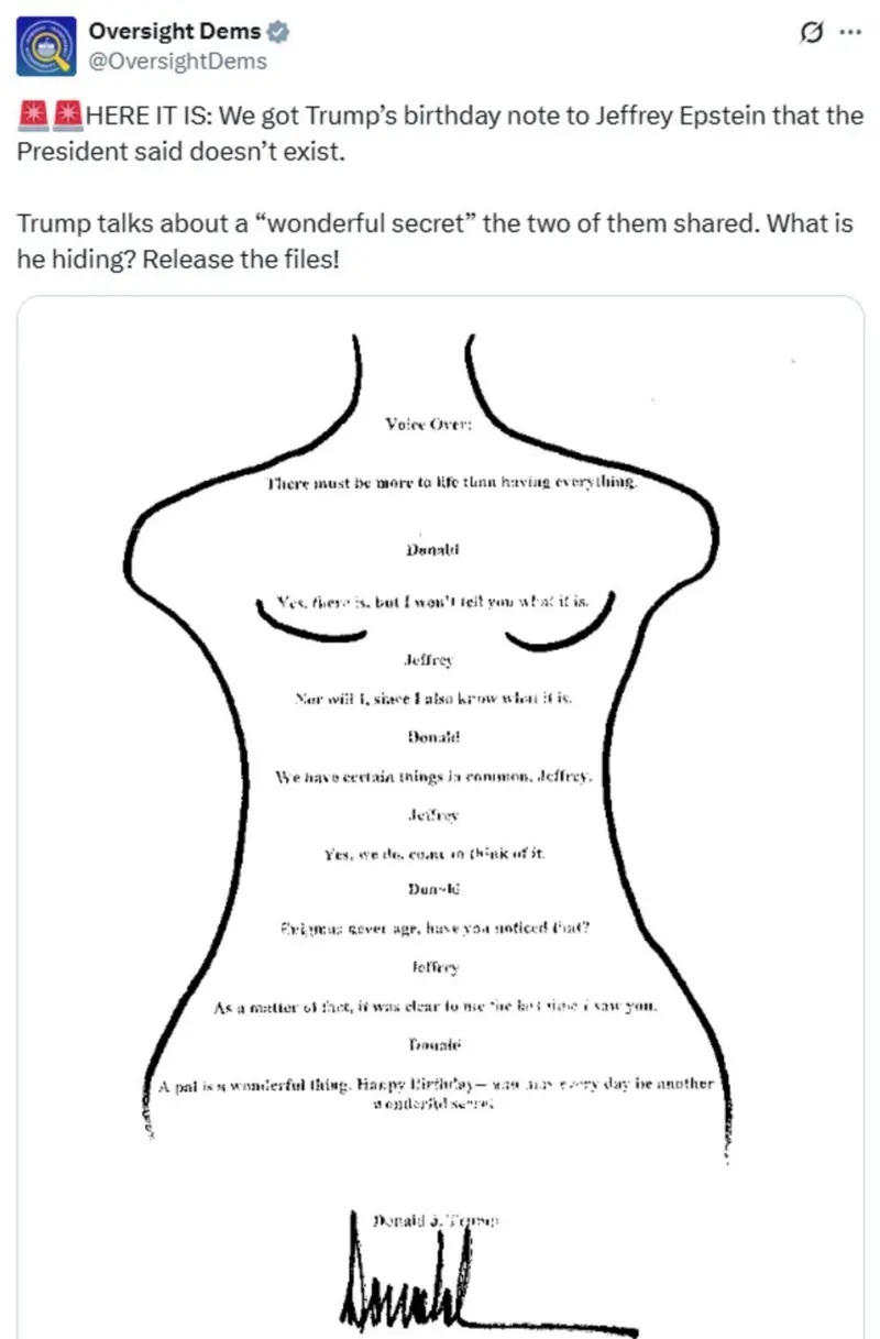 El lunes, Robert García, el demócrata de mayor rango en el comité, declaró: "El presidente Trump calificó la investigación de Epstein de engaño y afirmó que su nota de cumpleaños no existía".