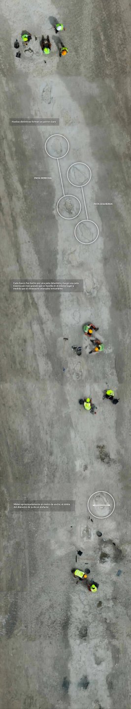 Mientras la criatura caminaba por el barro, hundiendo las patas con cada paso bajo su enorme peso, las huellas se secaron al sol. Luego, estos huecos endurecidos quedaron cubiertos por sedimentos, quizás por una marea de barro durante una tormenta.