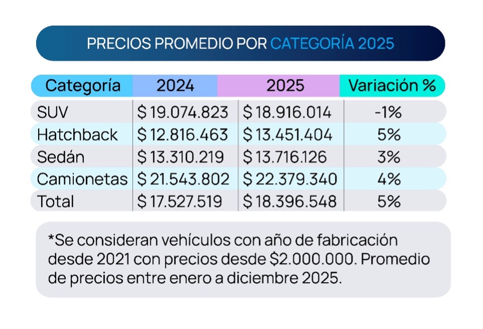 Por categoría, los hatchbacks lideraron el alza de precios, con un incremento cercano al 5%, seguidos por las camionetas con un 4%y los sedanes con un 3%. Los SUV, en contraste, fueron el único segmento que mostró una leve baja, reflejando una mayor oferta disponible frente a una demanda ya consolidada.