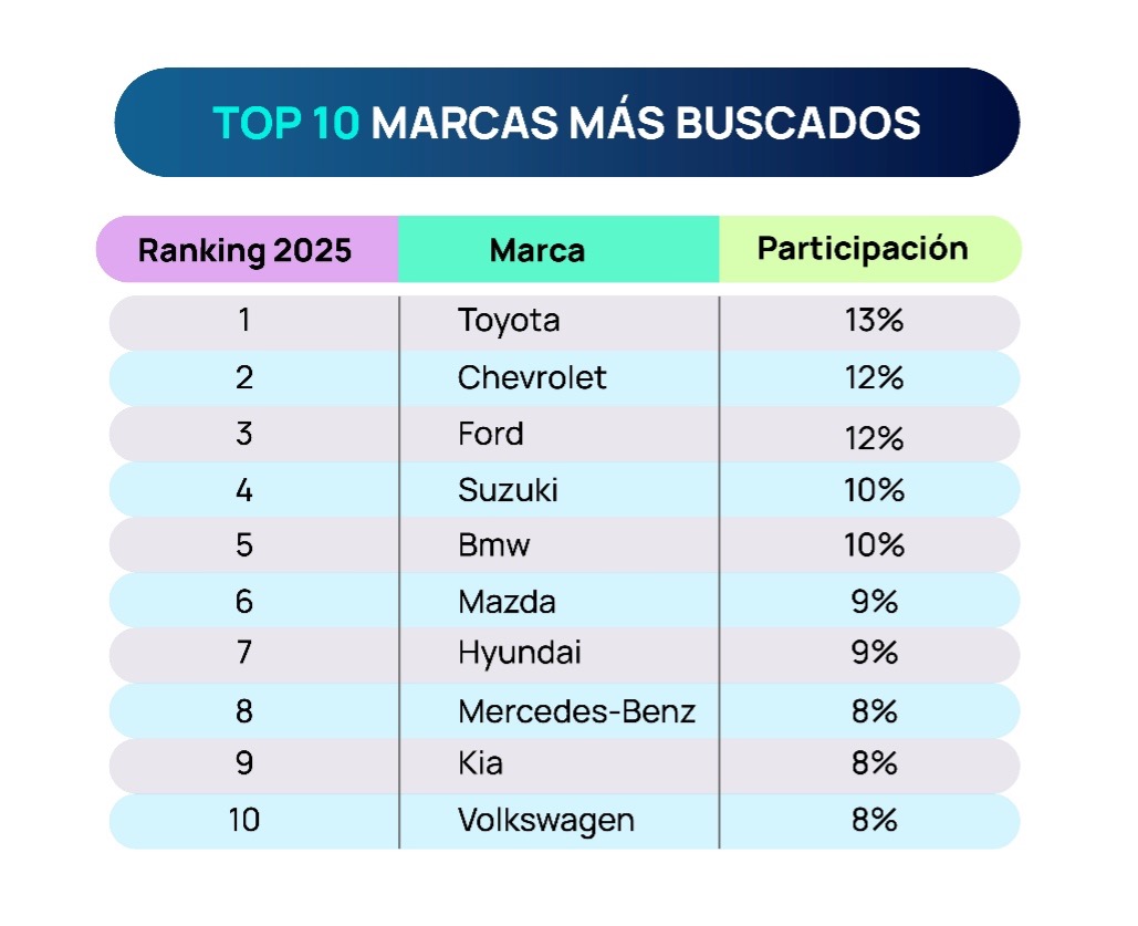 En 2025, la marca Toyota lideró el ranking de marcas más buscadas, con un 13% de participación, seguida muy de cerca por Chevrolet y Ford (12%), Suzuki y BMW (10%), y luego Mazda y Hyundai (9%). Cierran el top 10 Mercedes-Benz, Kia y Volkswagen (8%).