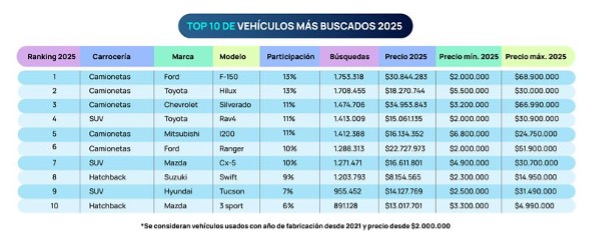 Referente al ranking de los modelos más buscados el 2025 existe una tendencia clara del mercado: las camionetas dominan la intención de búsqueda. Seis de los diez modelos pertenecen a esta carrocería y los tres primeros lugares están ocupados exclusivamente por camionetas, lideradas por Ford F-150, Toyota Hilux y Chevrolet Silverado.