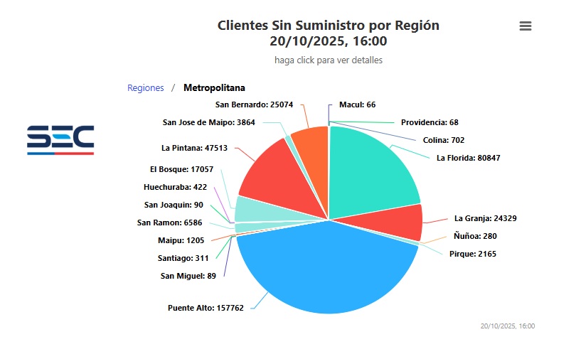 Por su parte, el Coordinador Eléctrico indicó: "Respecto del abastecimiento eléctrico en algunas comunas de Santiago, informamos que a las 15:42 horas se produjo una falla que afectó a las SSEE Florida, Andes, La Reina, Macul, Santa Elena, San Joaquín, Club Hípico, Bajos de Mena, Santa Raquel, Santa Rosa Sur, Mariscal y La Pintana, que abastecen la zona sur-poniente de la capital".