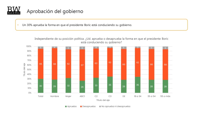 En cuanto a la gestión del Presidente Gabriel Boric, el sondeo indica que “un 30% aprueba la forma en que el Presidente Gabriel Boric está conduciendo su Gobierno”. Esta cifra representa una caída de dos puntos respecto a la semana anterior.