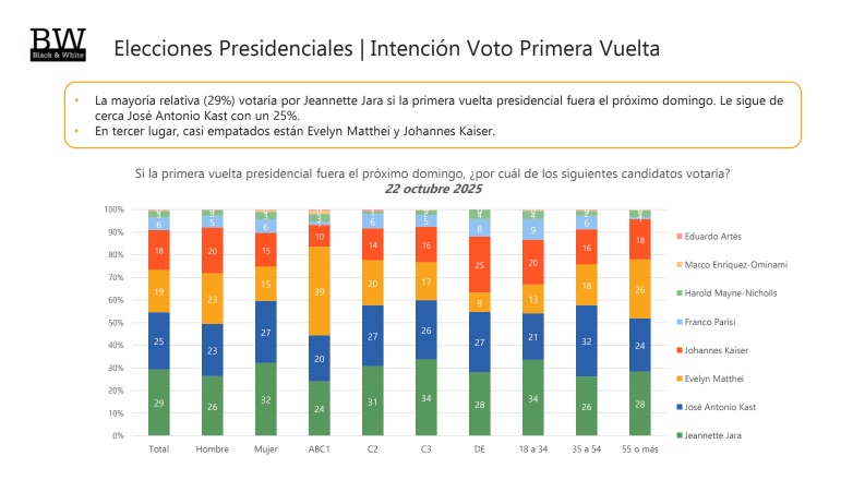La candidata oficialista Jeannette Jara (PC) continúa liderando la intención de voto para la primera vuelta presidencial, aunque con una leve baja respecto a la semana anterior. La mayoría relativa (29%) votaría por la militante del Partido Comunista si la primera vuelta presidencial fuera el próximo domingo.
