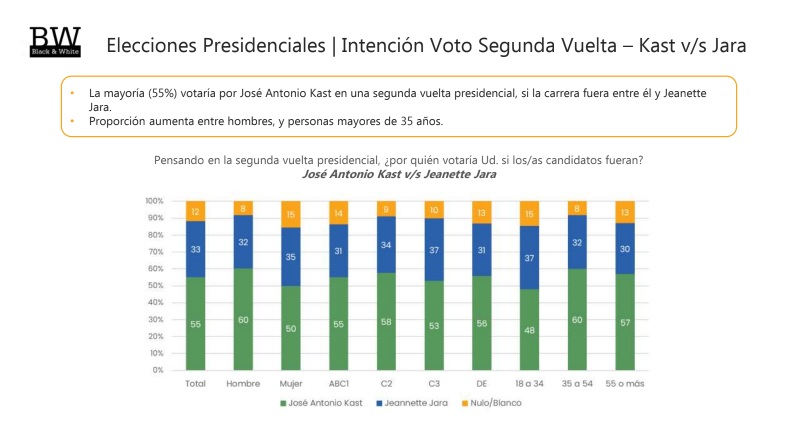 El estudio también proyecta resultados en eventuales definiciones presidenciales. En una segunda vuelta, la mayoría (55%) votaría por José Antonio Kast si la carrera fuera entre él y Jeannette Jara. La proporción de quienes se inclinan por esta opción aumenta entre hombres, y personas mayores de 35 años.