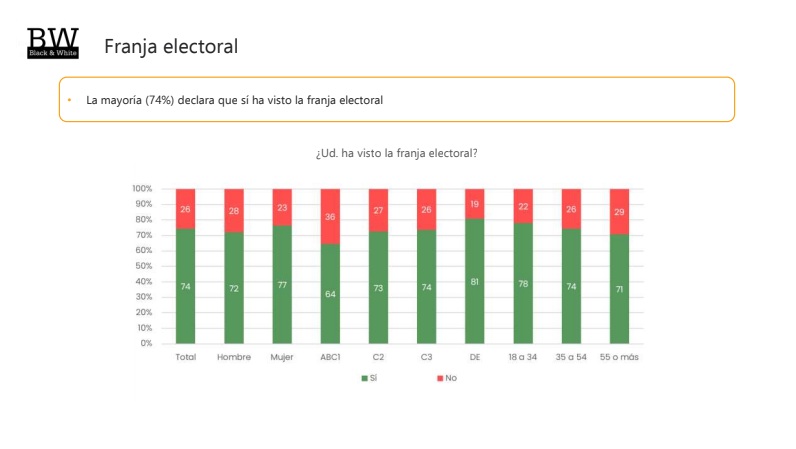 Respecto a la franja electoral -emitida desde el viernes 17 de octubre- el estudio muestra un alto nivel de exposición: la mayoría (74%) declara que sí la ha visto. Entre quienes han seguido la franja, los candidatos mejor evaluados son Jara, Kast, Kaiser y Matthei. En este grupo, Harold Mayne-Nicholls destaca en su evaluación en la franja, en relación a su votación.
