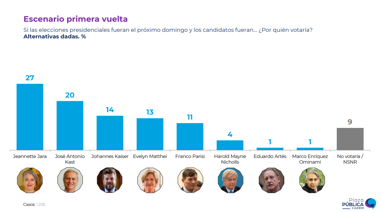 Si la elección fuera el próximo domingo y se considerara una base 100 de votantes, Jara llegaría al 30%, Kast al 22%, Kaiser al 15%, Matthei al 14% y Parisi al 12%, seguidos por Mayne-Nicholls (5%), Artés (1%) y Enríquez-Ominami (1%).