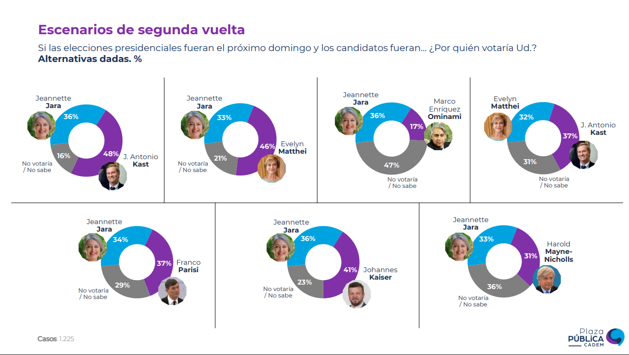 El escenario de balotaje sigue siendo adverso para la candidata oficialista. Según Cadem, Jara perdería con Kast (36% vs 48%), con Matthei (33% vs 46%), con Kaiser (36% vs 41%) y con Parisi (34% vs 37%). En cambio, vencería a Enríquez-Ominami (36% vs 17%) y a Mayne-Nicholls (33% vs 31%).