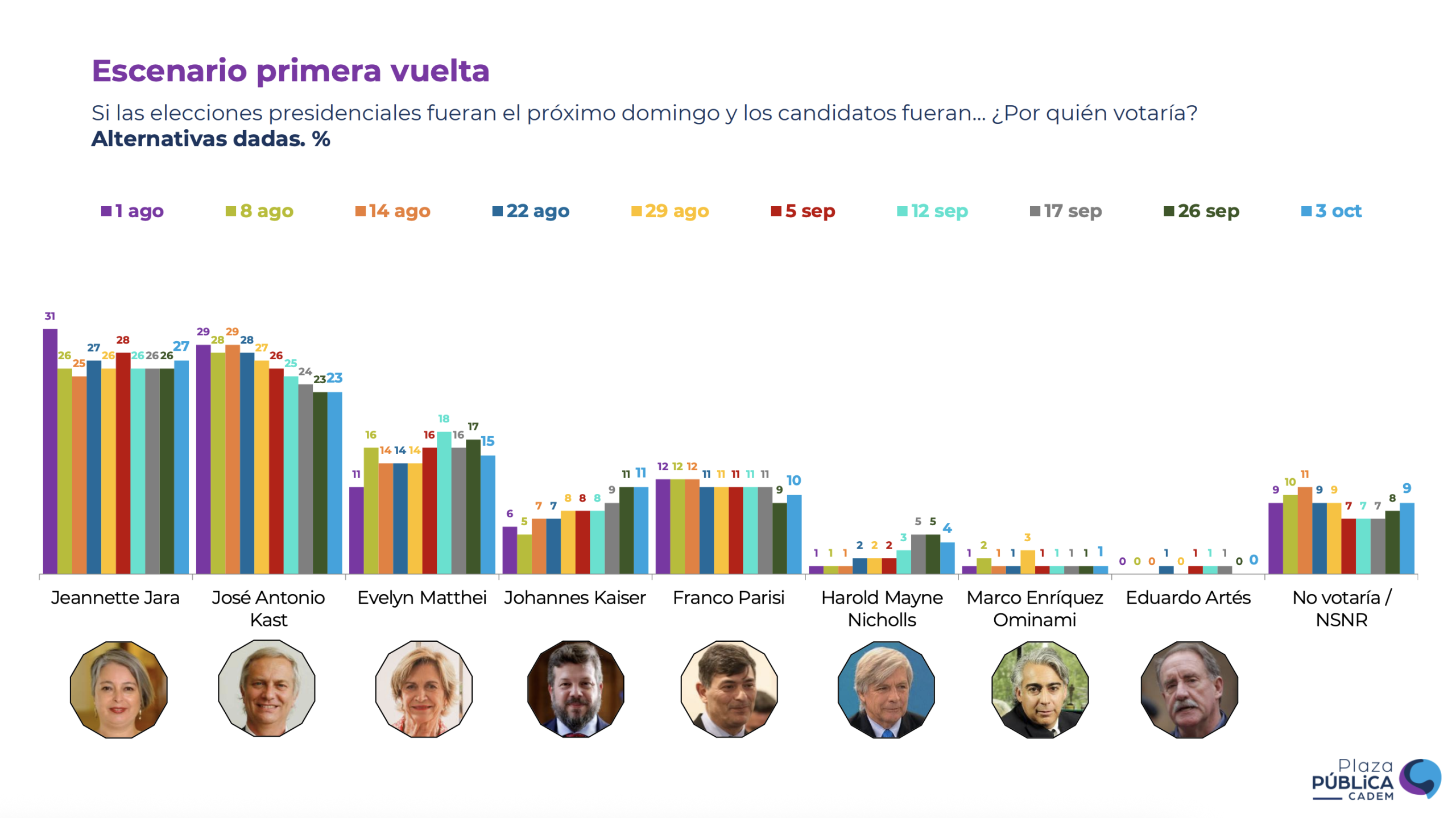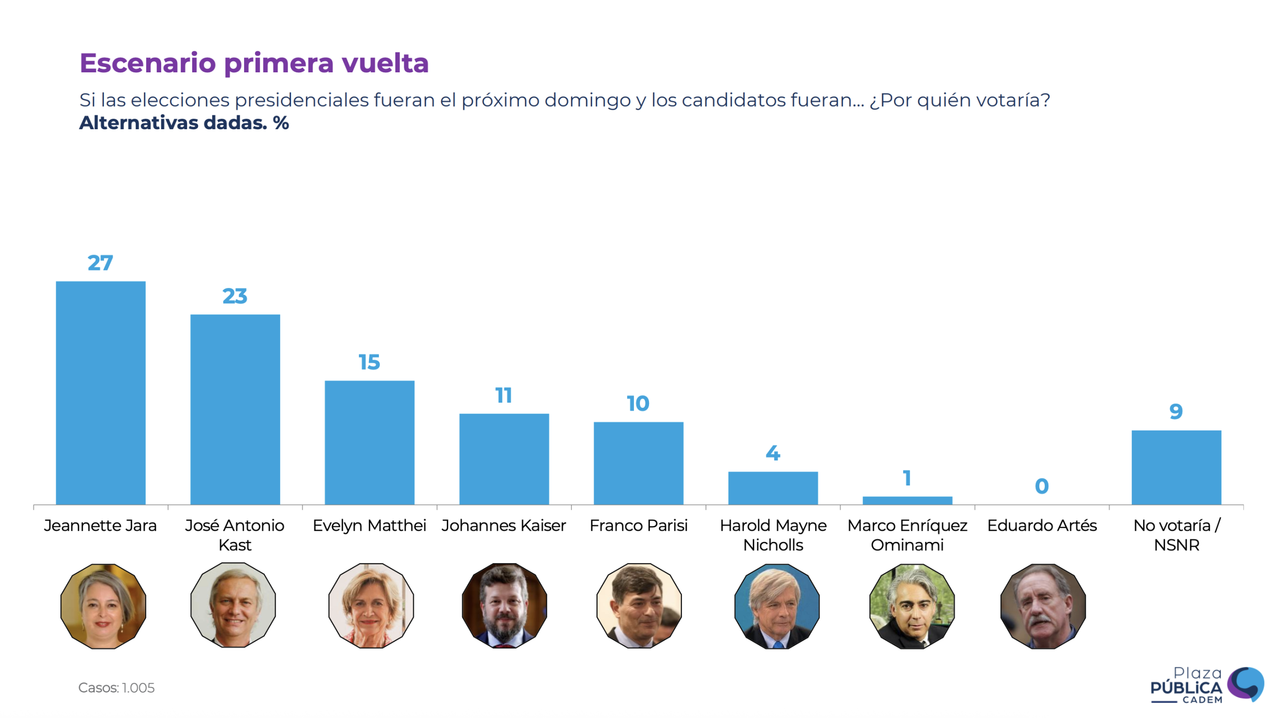 La última Encuesta Plaza Pública de Cadem muestra que el escenario presidencial continúa estrechándose, con la candidata del oficialismo, Jeannette Jara (PC), consolidándose en el primer lugar con 27% de apoyo, un punto más que la medición anterior. En segundo puesto se ubica José Antonio Kast (Partido Republicano) con 23%, mientras que Evelyn Matthei (UDI) baja dos puntos y se mantiene en el tercer lugar con 15%.