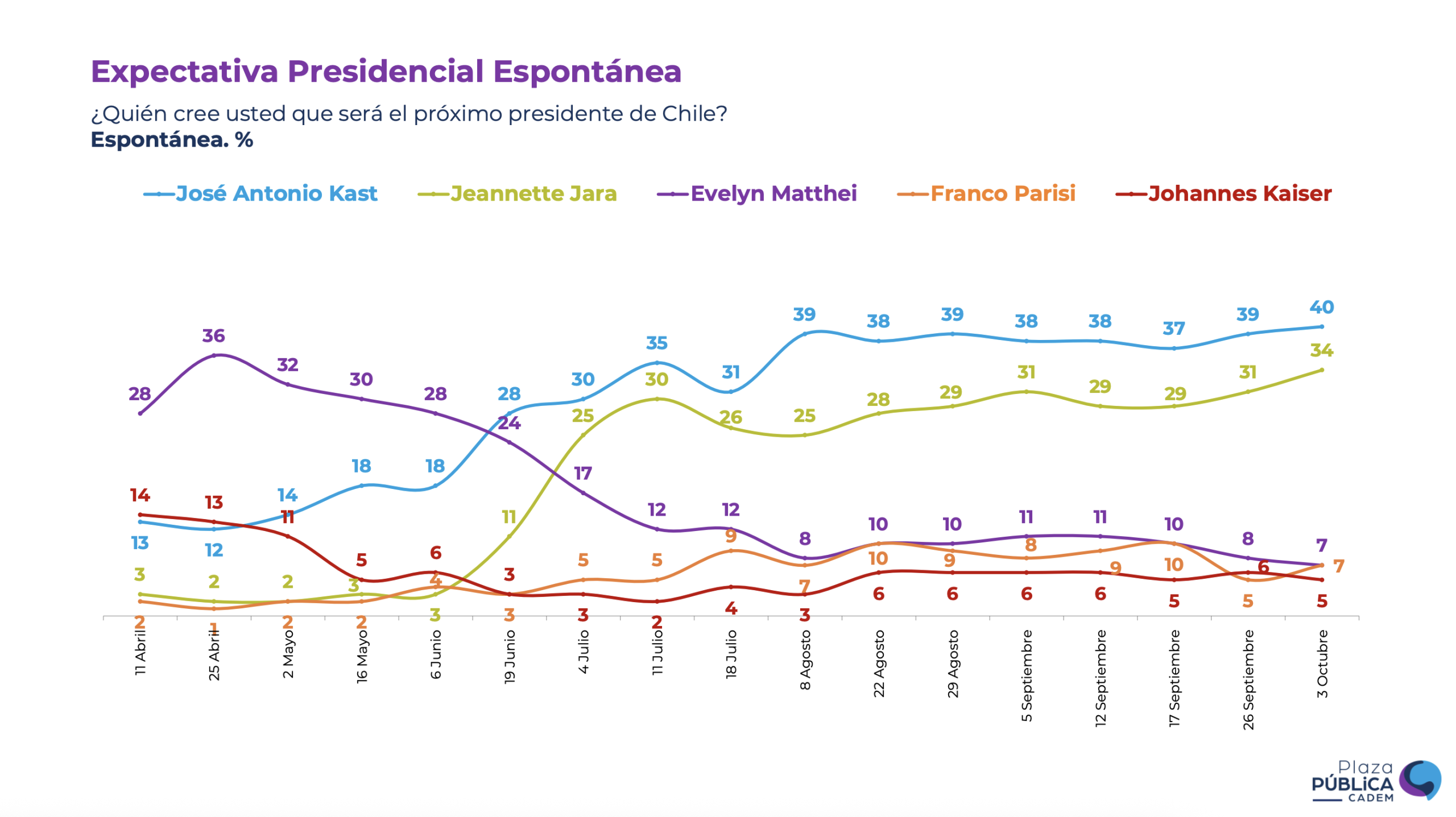En cuanto a la expectativa presidencial espontánea, es decir, a quién se percibe como el más probable ganador, José Antonio Kast alcanza su mejor registro desde abril con 40%, seis puntos por encima de Jara, quien también mejora y llega a 34%. Más atrás se ubican Matthei y Parisi (7%), mientras que Kaiser alcanza 5% en este indicador.