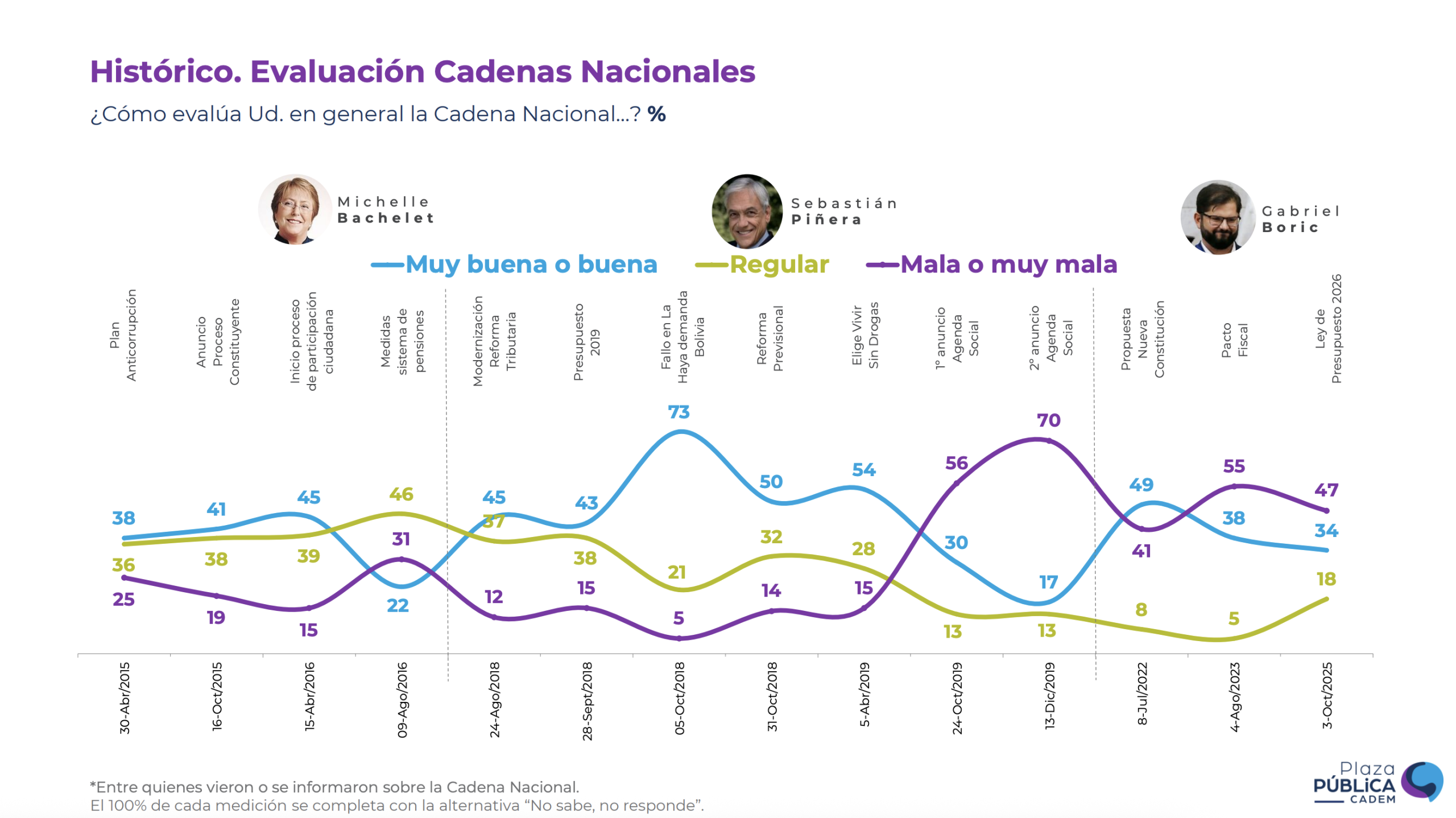 Sobre la Ley de Presupuesto 2026, 61% de los encuestados afirmó haber escuchado o visto información sobre el anuncio realizado por el Presidente Gabriel Boric, aunque solo un 34% lo evalúa positivamente. Además, 54% se mostró en desacuerdo con la eliminación de los 600 millones de dólares de libre disposición para el próximo gobierno, medida incorporada en la propuesta del Ejecutivo.