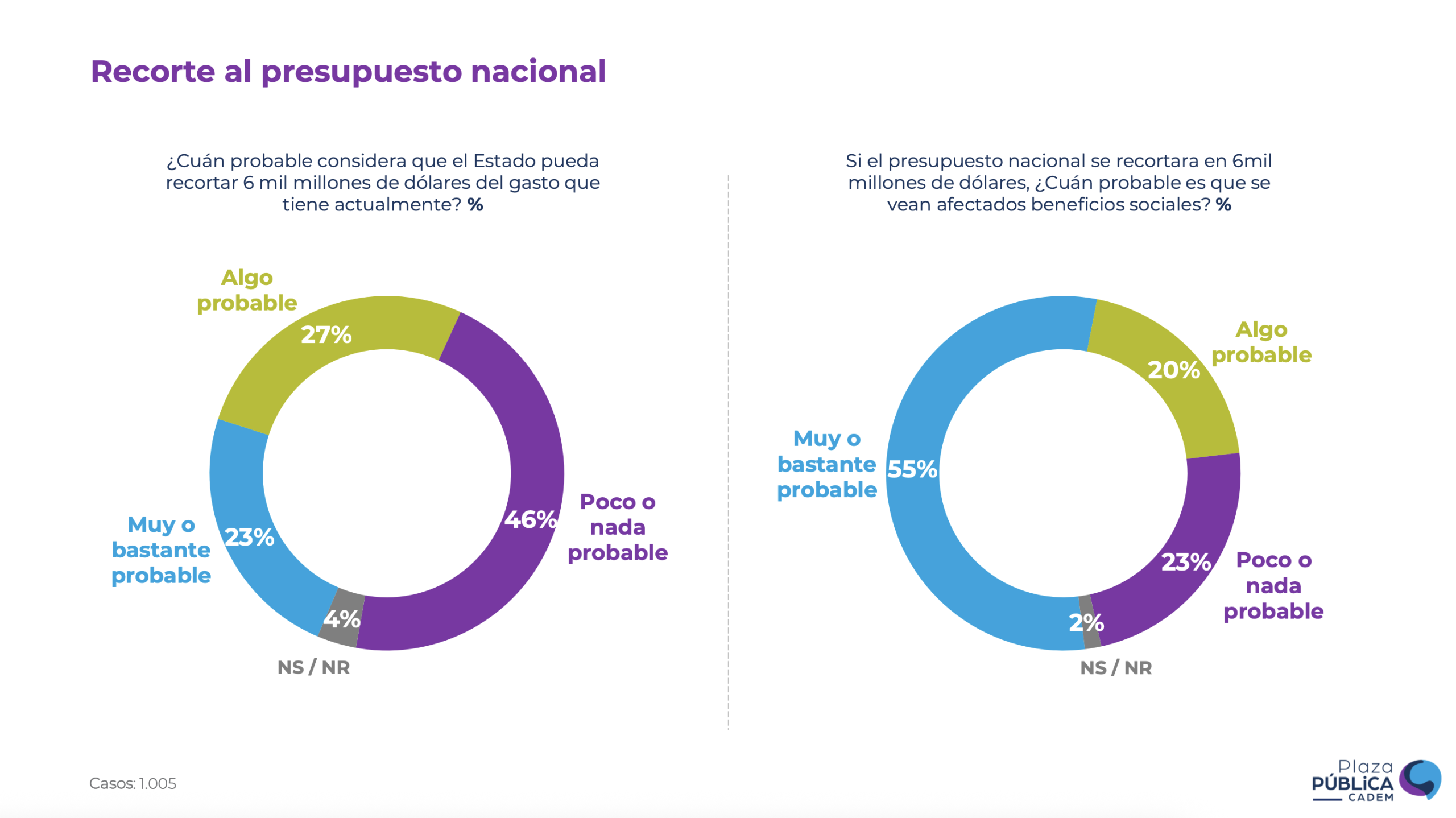 Finalmente, 46% cree poco o nada probable que el Estado logre reducir 6 mil millones de dólares en gasto, como se ha planteado desde algunos sectores, y un 55% considera muy probable que esos recortes afecten los beneficios sociales.