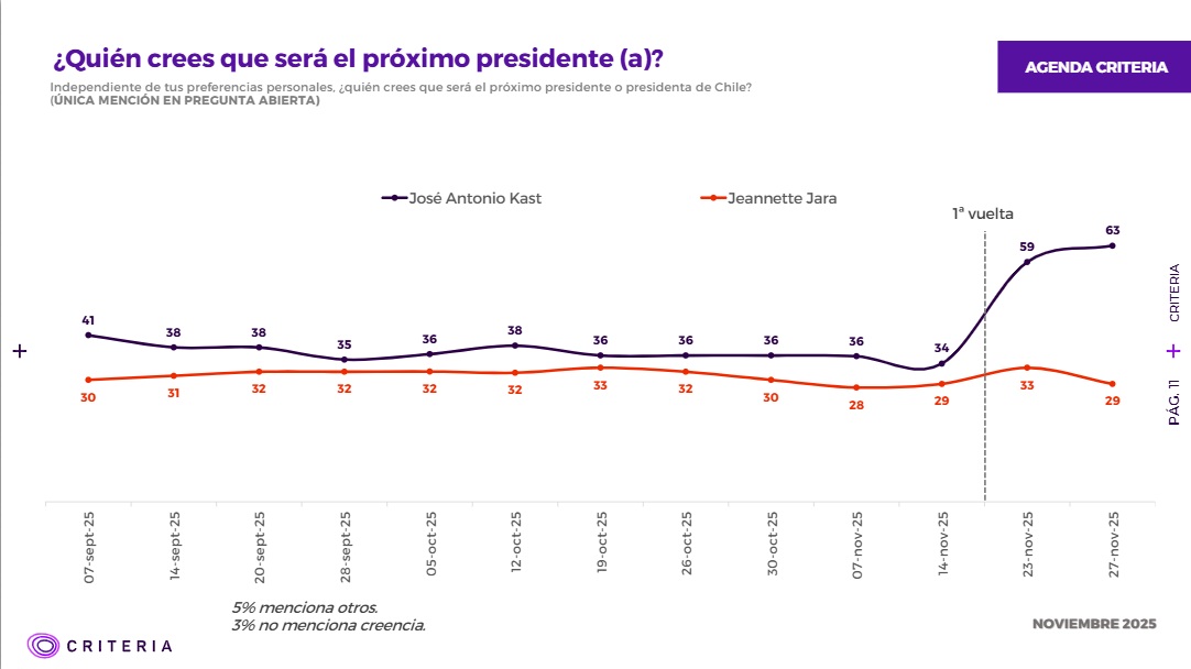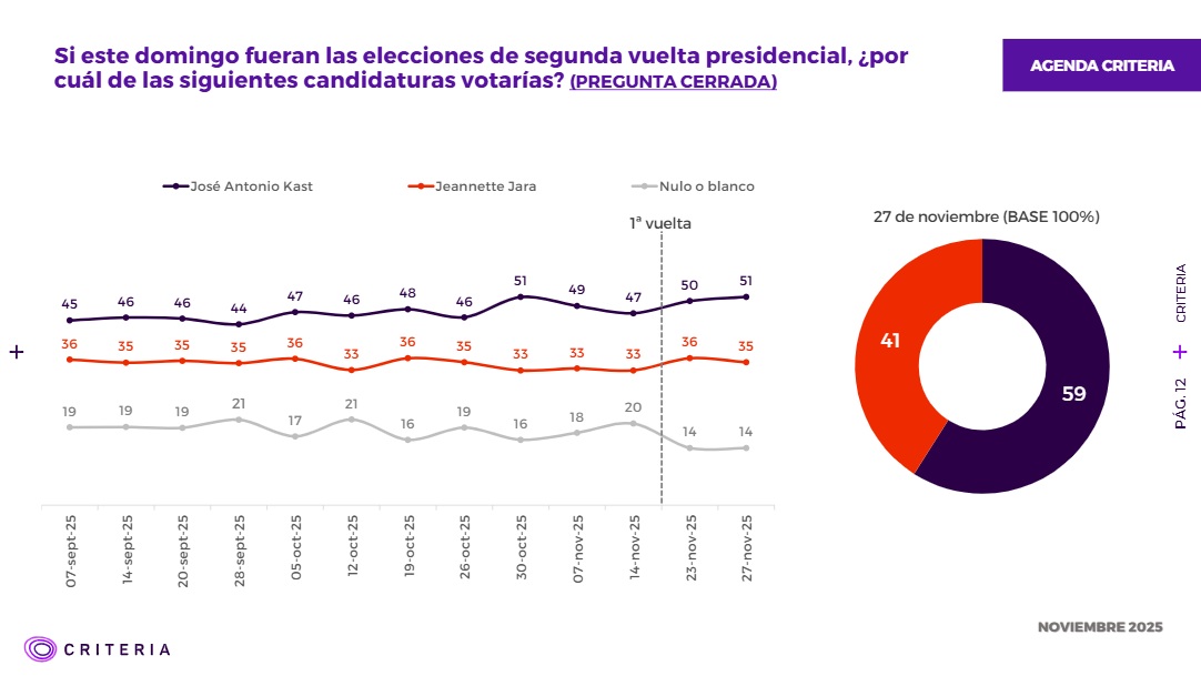 La encuesta Criteria aplicada entre el 24 y el 26 de noviembre dio a conocer un nuevo sondeo que señala que en segunda vuelta, el abanderado del Partido Republicano, José Antonio Kast, se impondría con un 51%, frente a un 35% de Jeannette Jara (Unidad por Chile y la DC).