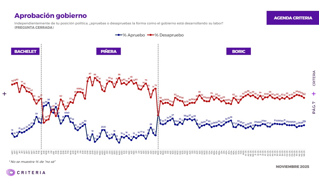 La aprobación del Gobierno también sube un punto, llegando a un 29%. La desaprobación al Ejecutivo, en tanto, baja 2 puntos, pero se mantiene en un nivel elevado, con un 62%.