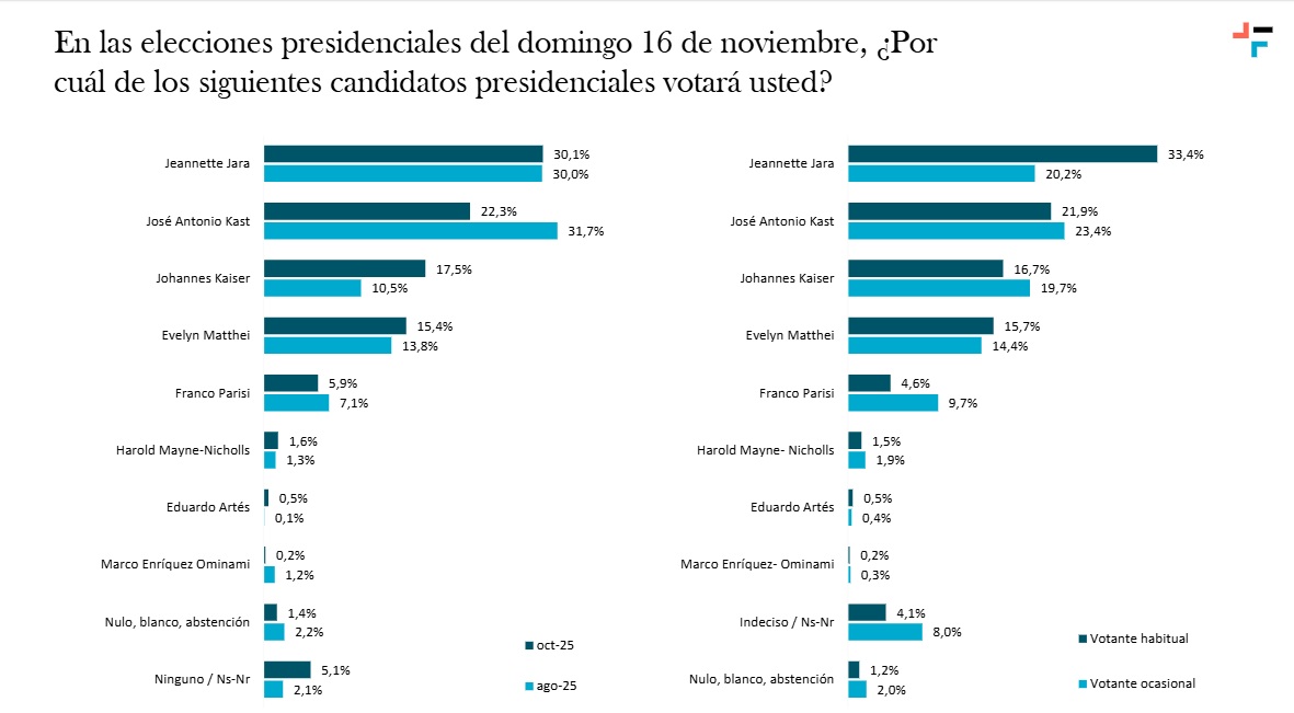 La última encuesta Feedback arrojó que la candidata del oficialismo, Jeannette Jara, aparece en el primer lugar con un 30,1% de las preferencias de cara a la primera vuelta del 16 de noviembre.