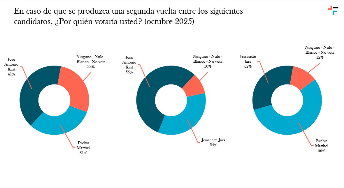 En escenarios de segunda vuelta, Kast superaría a Matthei por 41% a 31%, con 28% de ninguno, nulo, blanco o no vota; Kast vence a Jara por 56% a 34%, con 10% de ninguno, nulo, blanco o no vota; y Matthei a Jara por 56% a 34%, con 10% de ninguno, nulo, blanco o no vota.