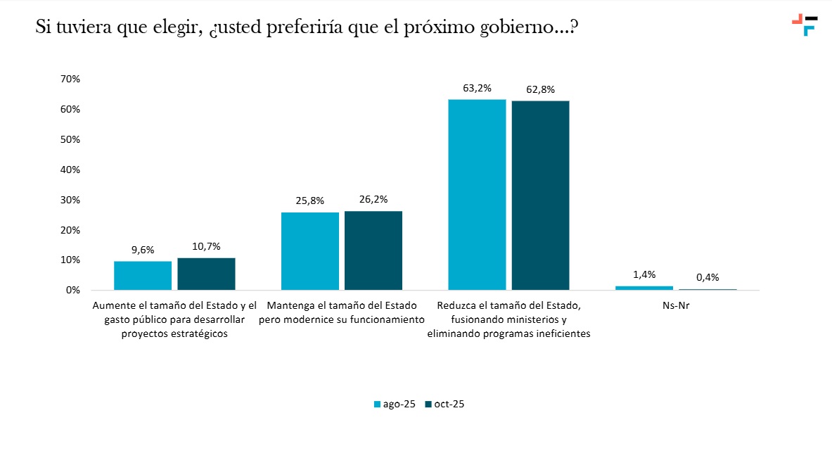 En otros temas, el 62,8% de los encuestados prefiere que el próximo gobierno reduzca el tamaño del Estado, mediante la fusión de ministerios y la eliminación de programas ineficientes.