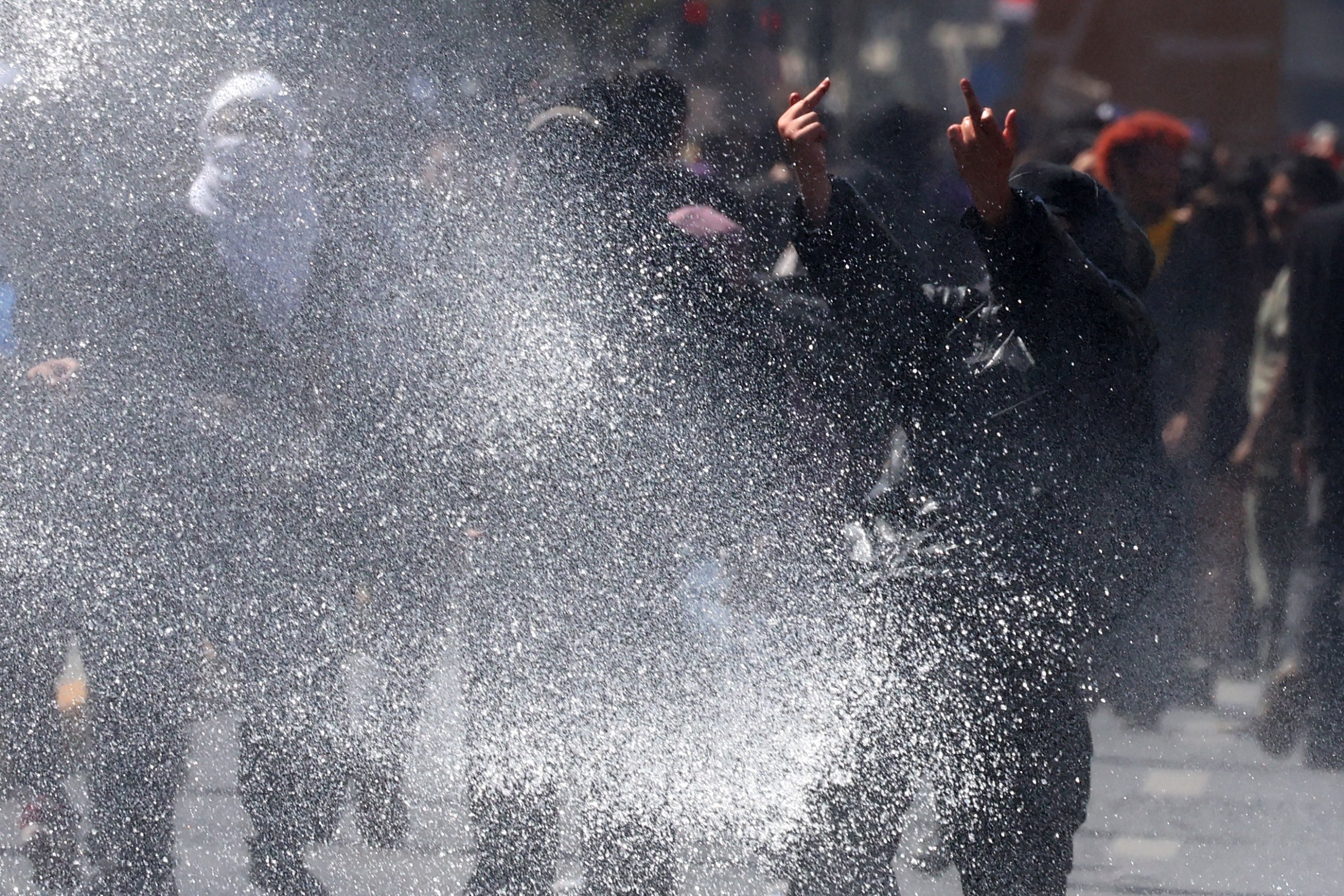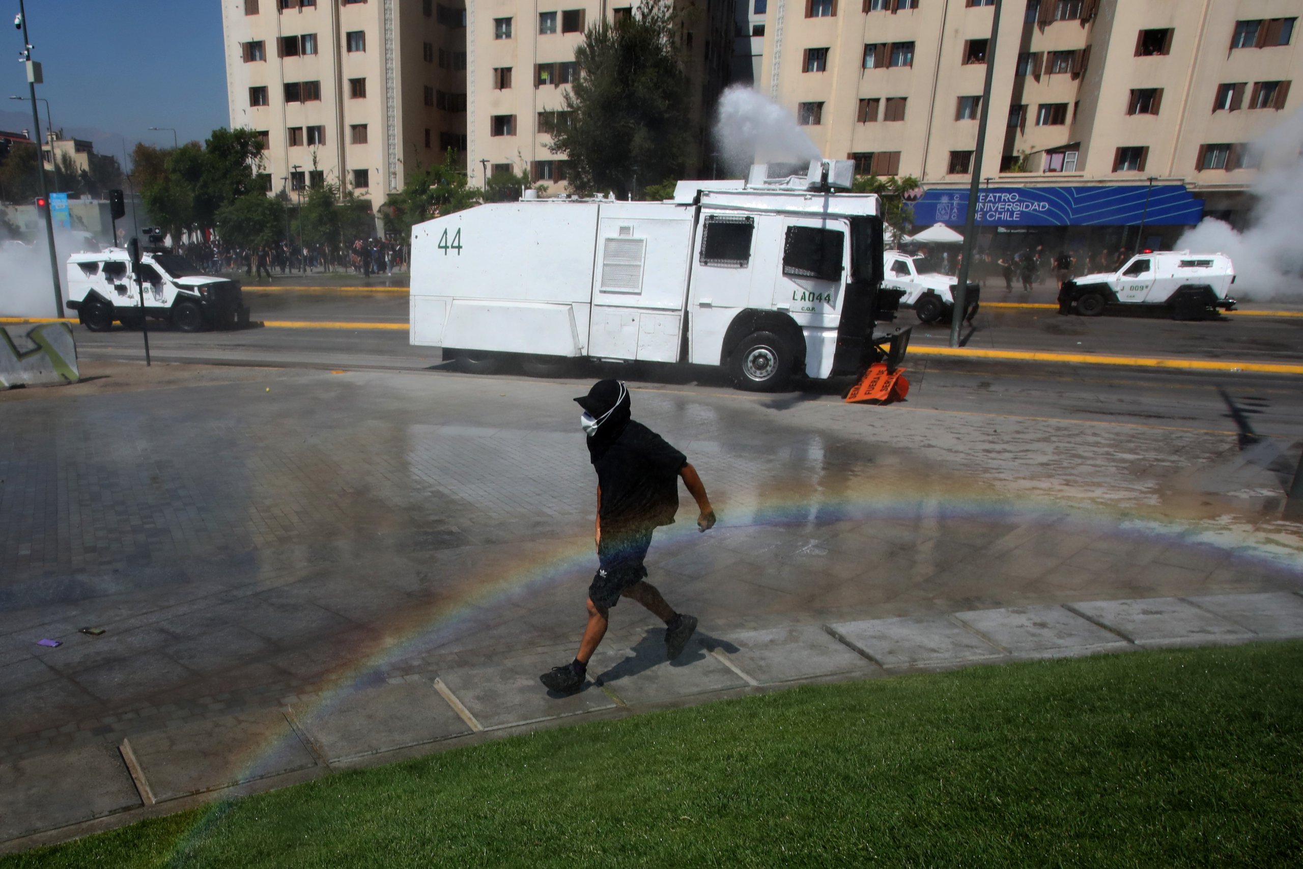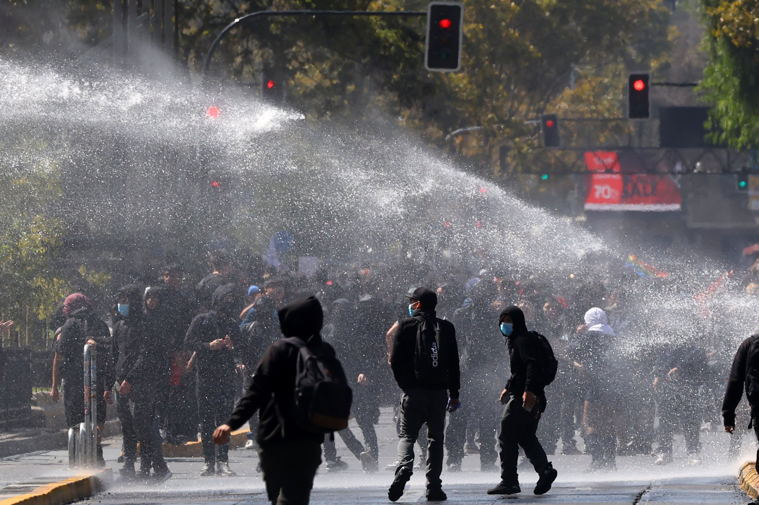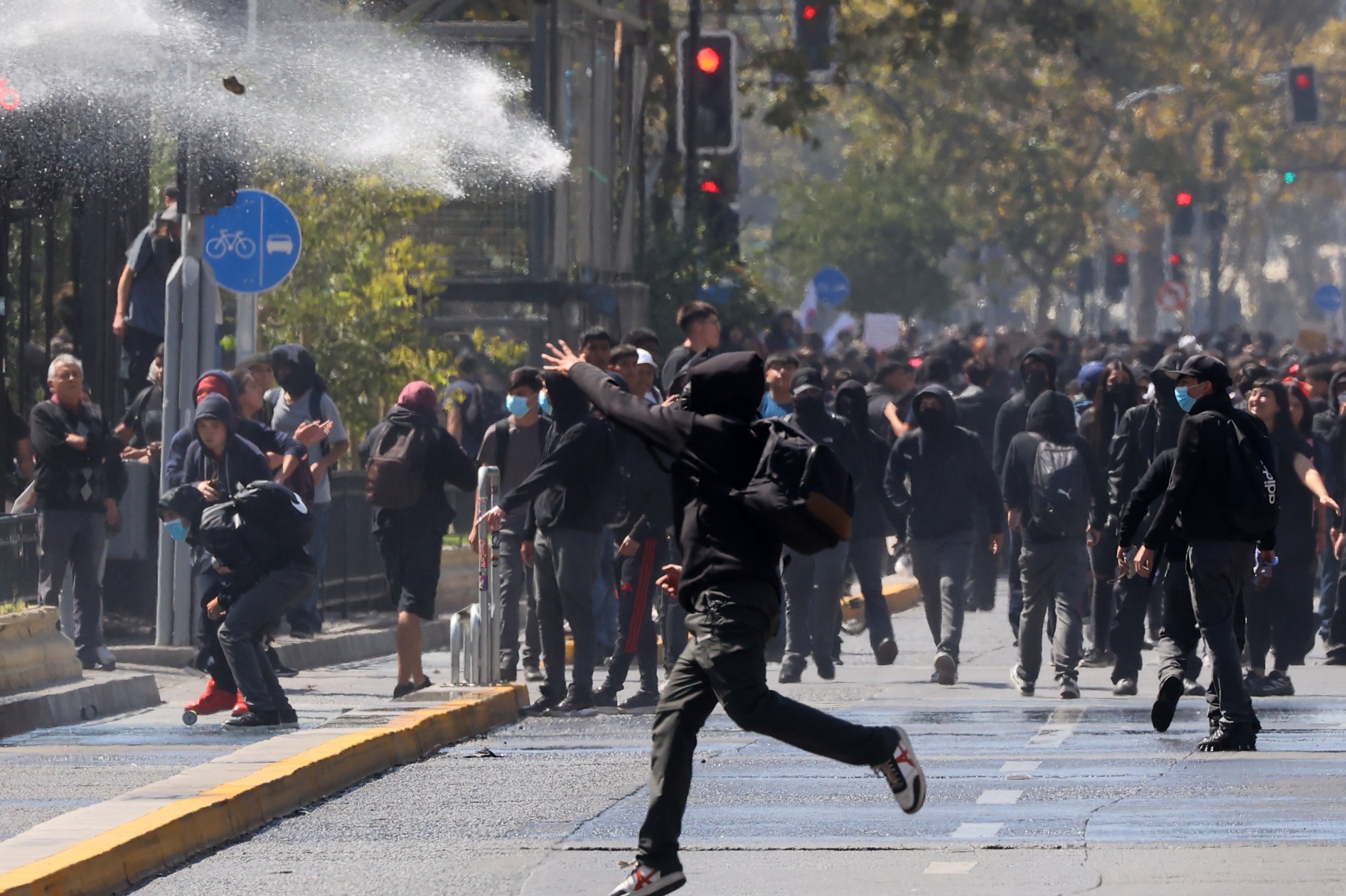 Posteriormente, los manifestantes se desplazaron hacia plaza Baquedano, donde fueron dispersados con carros lanzaagua.