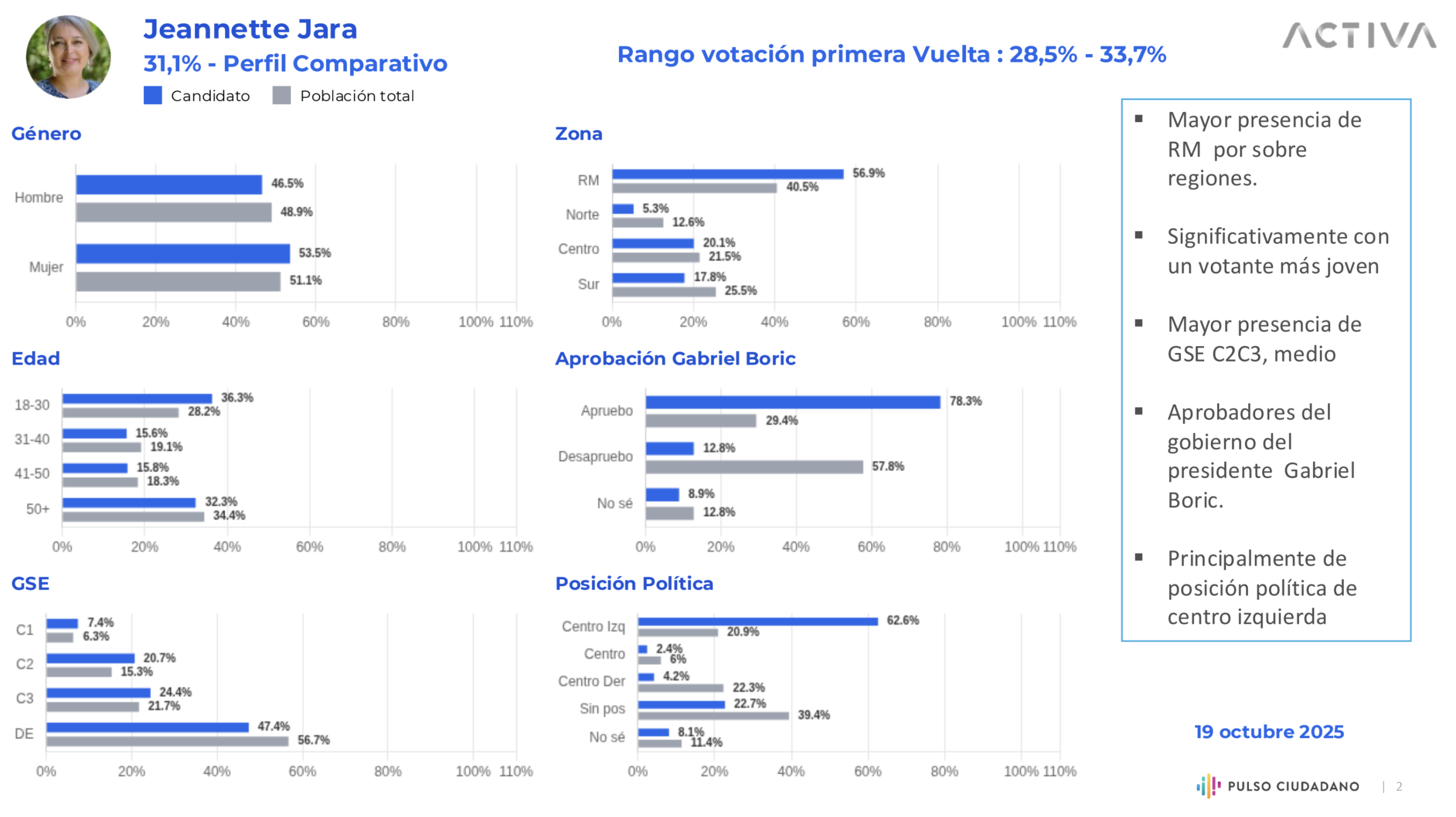 La empresa Activa, a través de su encuesta «Pulso Ciudadano», realizó un estudio que analiza los perfiles de los votantes de los principales candidatos presidenciales de Chile, de cara a las elecciones que tendrán lugar el próximo 16 de noviembre.
