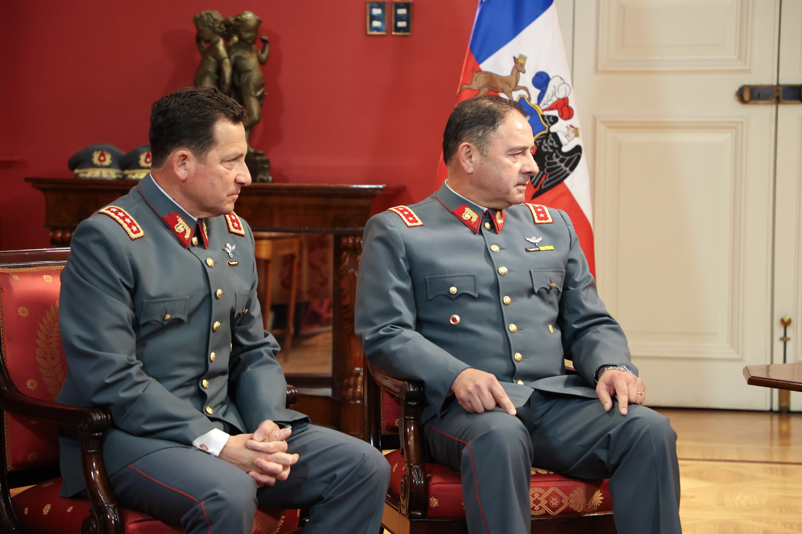 El jefe de Estado, junto a la ministra de Defensa Nacional, Adriana Delpiano, recibió en el Palacio de La Moneda al actual comandante en jefe del Ejército, general, Javier Iturriaga y al general Varela.