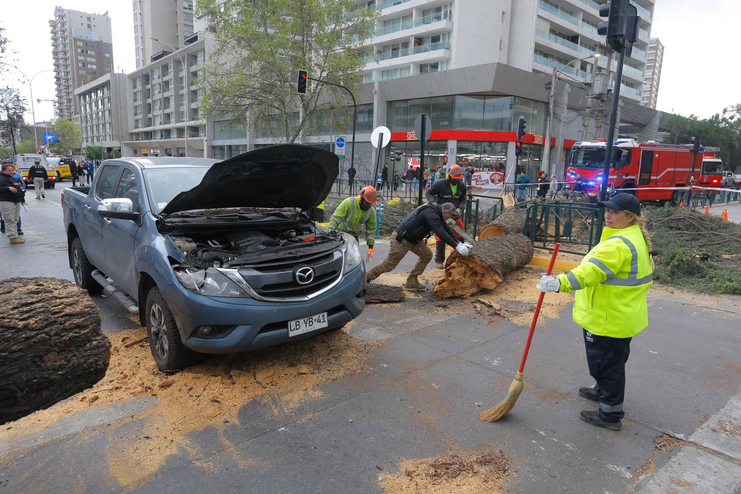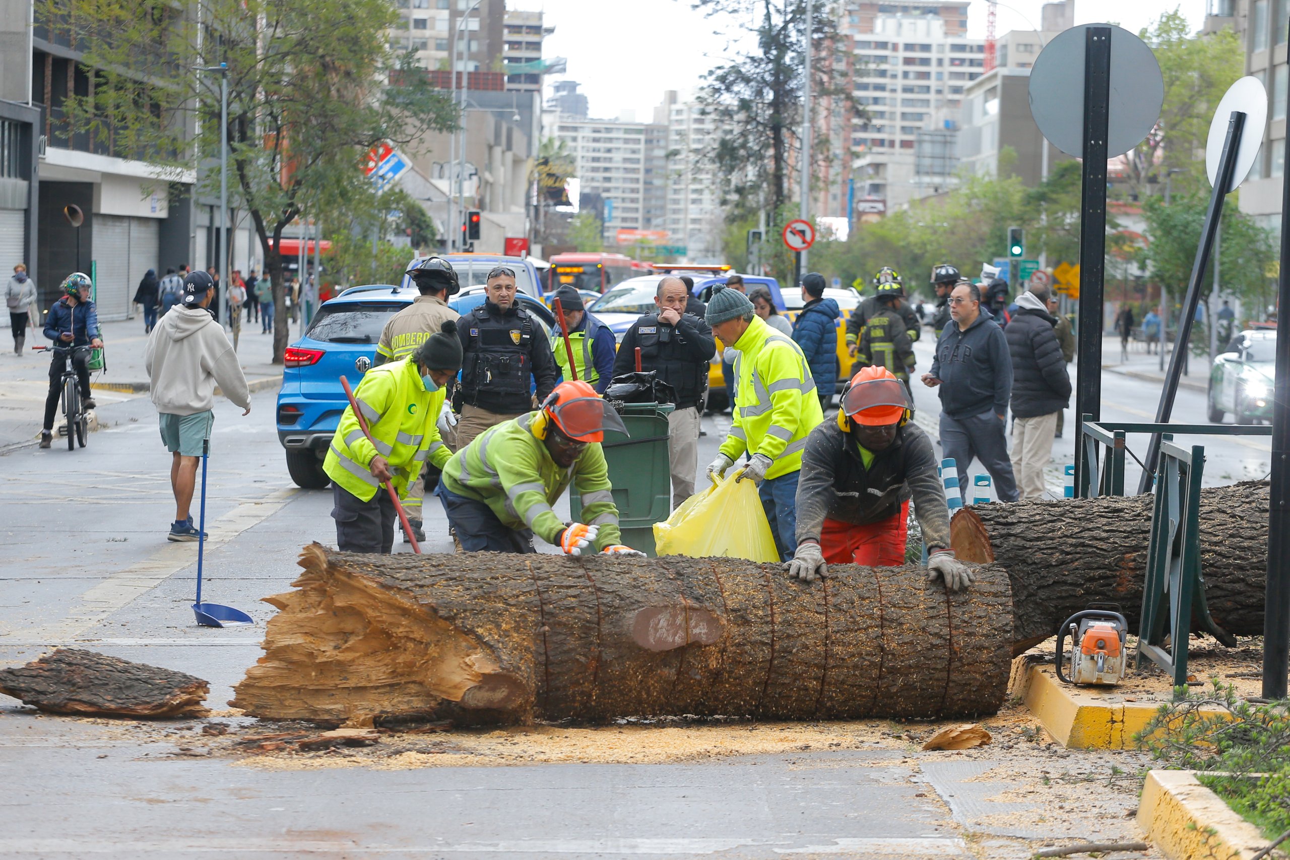 Personal municipal y de emergencia trabaja en el lugar para retirar el árbol y despejar la vía. “Se va a ir normalizando una vez que saquen la madera del lugar el personal de Bomberos, que nos está cooperando con el personal de emergencia de la Municipalidad de Ñuñoa para poder retirar los escombros que se mantienen y la madera del árbol que fue caído y las ramas que se están cortando”, detalló el capitán Palma.