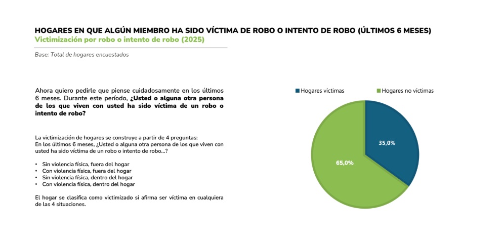 De acuerdo con los resultados, el 35,0% de los hogares de las grandes ciudades del país declara haber sido víctima de un robo o intento de robo en los últimos seis meses, cifra que se mantiene estable respecto de la medición de 2024.
