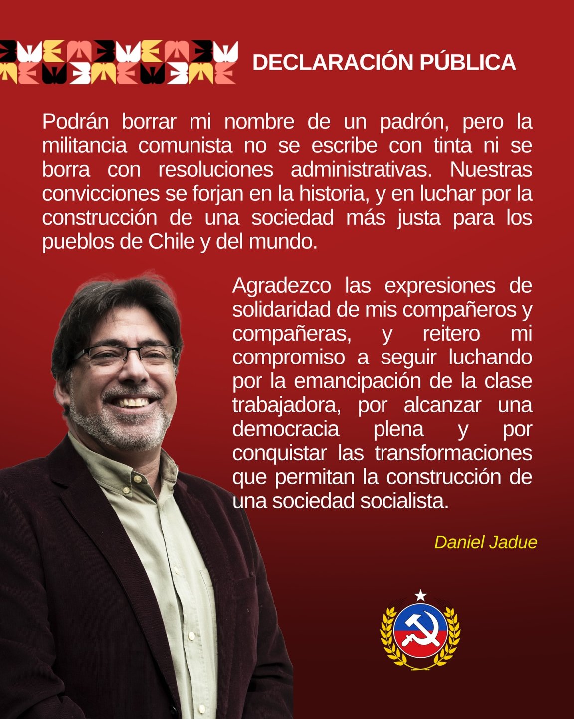 Además, afirmó que "podrán borrar mi nombre de un padrón, pero la militancia comunista no se escribe con tinta ni se borra con resoluciones administrativas".