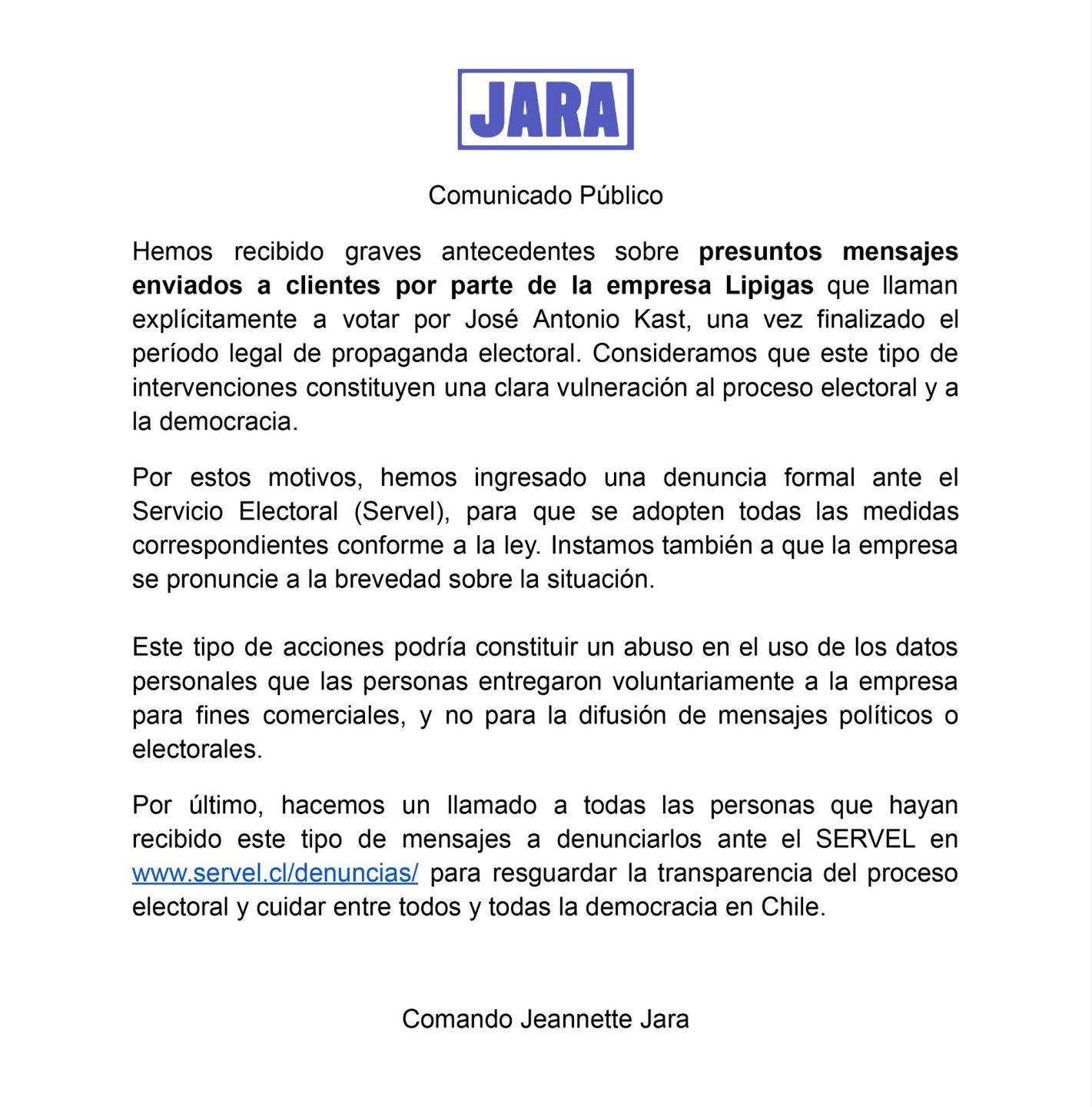 “Hemos recibido graves antecedentes sobre presuntos mensajes enviados a clientes por parte de la empresa Lipigas que llaman explícitamente a votar por José Antonio Kast, una vez finalizado el período legal de propaganda electoral”.